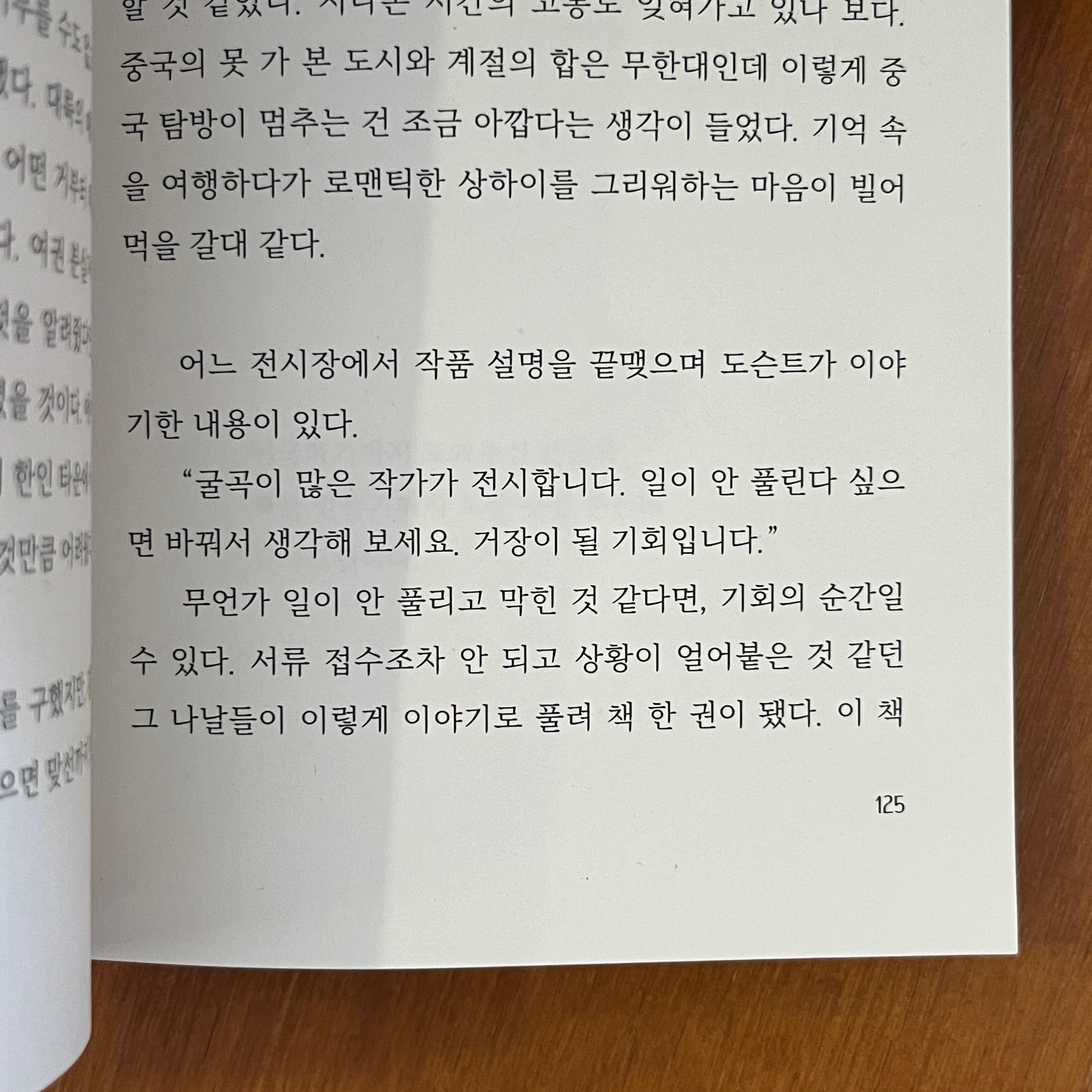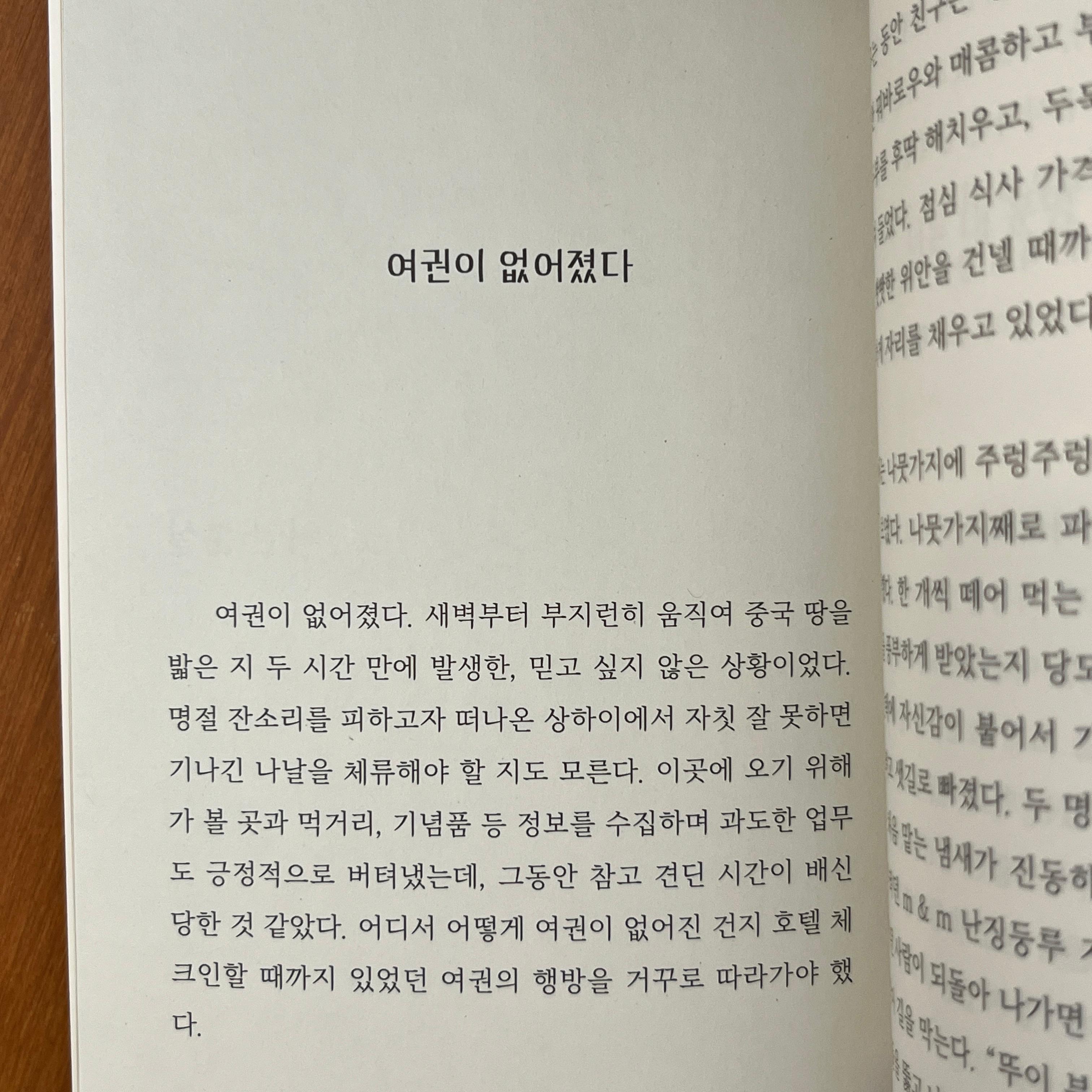 로맨틱한 상하이는 한순간에 빌어먹을 도시가 되었다. 집에 돌아갈 수 없고 어딘가 머무를 수도 없고, 생존하기 위한 방법을 스스로 모색해야 했다. 대륙의 매력이 부질없게 느껴졌다. 영사관에 연락하면 어떤 거부터 해야 하는지 가이드라인이라도 받을 줄 알았다. 여권 분실자가 해야 할 것과 영사관이 도와줄 수 있는 것을 알려줬다면 마음을 의지하고 중국 공공기관을 찾아다녔을 것이다. 에어비앤비가 상용화되지 않은 시절에 여행객이 한인 타운에서 민박집을 찾 는 건 모래사장에서 바늘 찾는 것만큼 어려웠다.