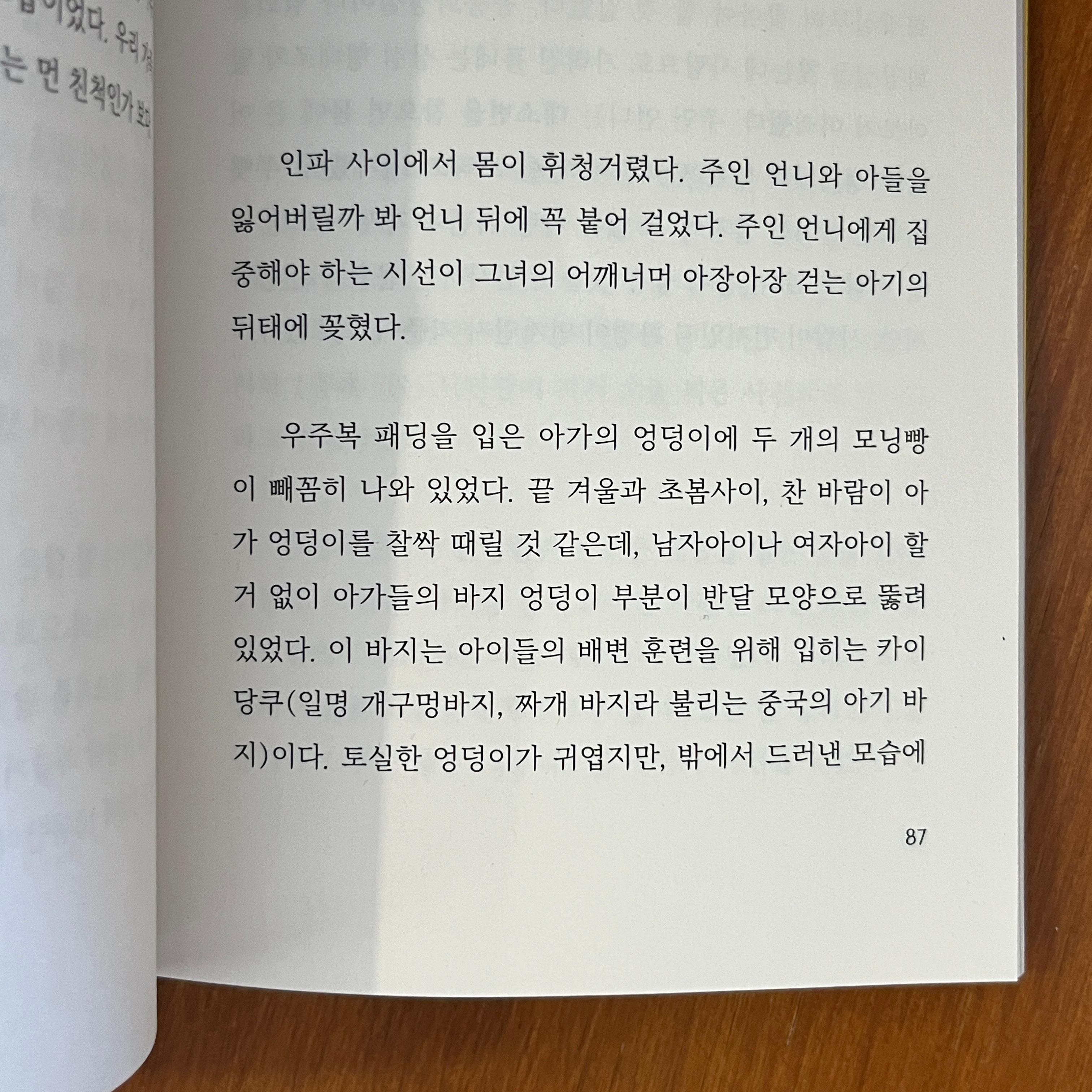 우주복 패딩을 입은 아가의 엉덩이에 두 개의 모닝빵이 빼꼼히 나와 있었다. 끝 겨울과 초봄사이, 찬 바람이 아가 엉덩이를 찰싹 때릴 것 같은데, 남자아이나 여자아이 할거 없이 아가들의 바지 엉덩이 부분이 반달 모양으로 뚫려 있었다. 이 바지는 아이들의 배변 훈련을 위해 입히는 카이당쿠(일명 개구멍바지, 짜개 바지라 불리는 중국의 아기 바지)이다. 토실한 엉덩이가 귀엽지만, 밖에서 드러낸 모습에...