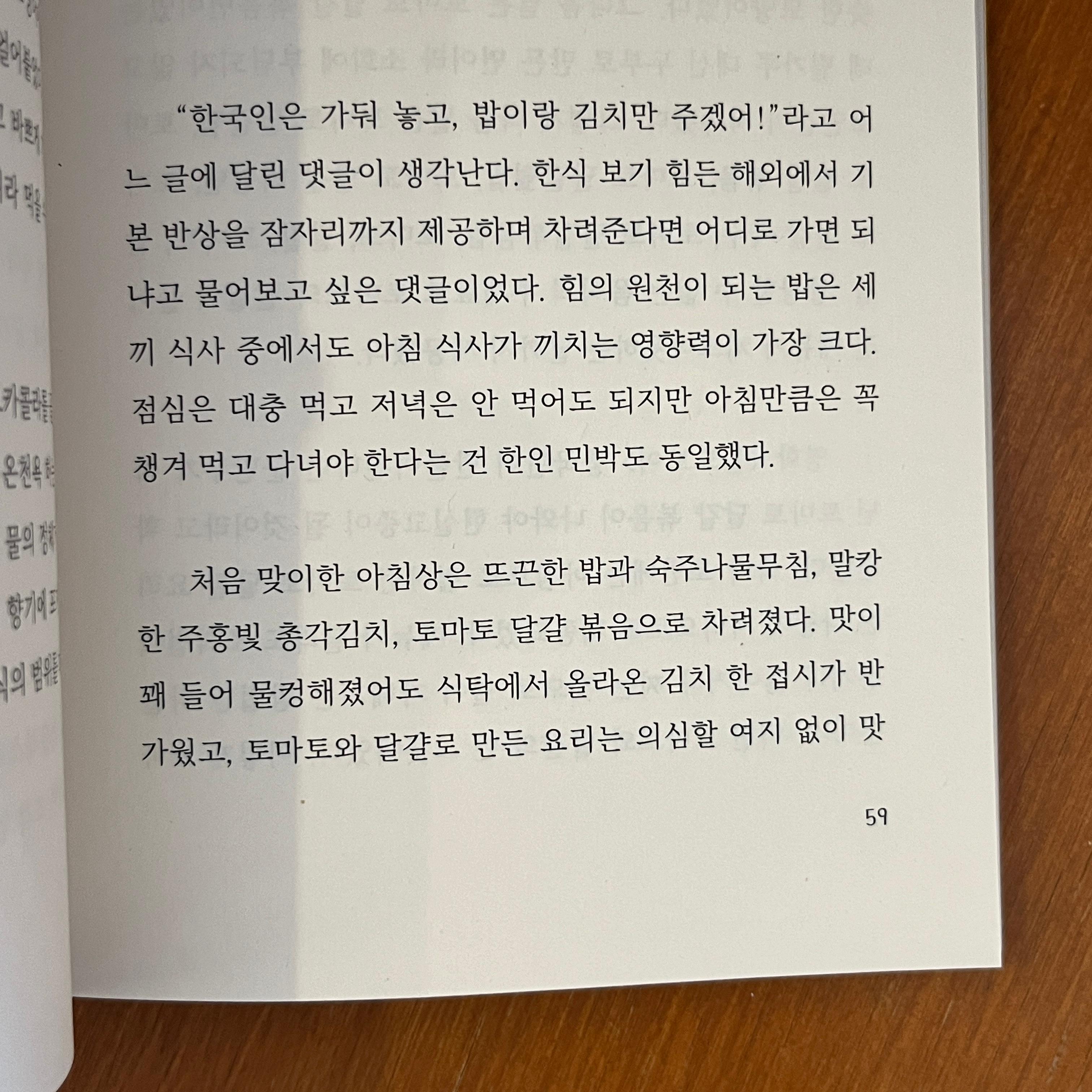 "한국인은 가둬 놓고, 밥이랑 김치만 주겠어!"라고 어느 글에 달린 댓글이 생각난다. 한식 보기 힘든 해외에서 기본 반상을 잠자리까지 제공하며 차려준다면 어디로 가면 되냐고 물어보고 싶은 댓글이었다. 힘의 원천이 되는 밥은 세끼 식사 중에서도 아침 식사가 끼치는 영향력이 가장 크다. 점심은 대충 먹고 저녁은 안 먹어도 되지만 아침만큼은 꼭 챙겨 먹고 다녀야 한다는 건 한인 민박도 동일했다.