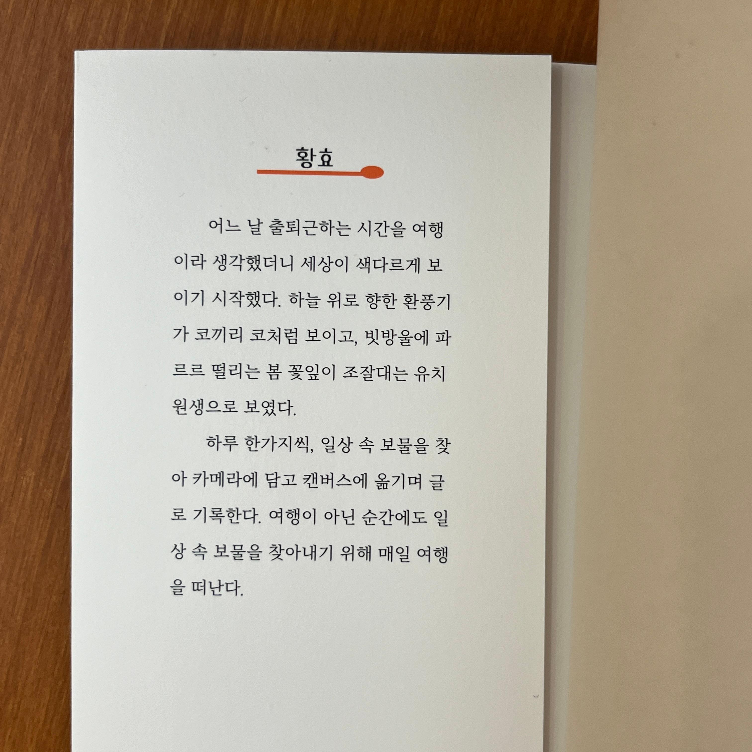 하루 한가지씩, 일상 속 보물을 찾아 카메라에 담고 캔버스에 옮기며 글로 기록한다. 여행이 아닌 순간에도 일상 속 보물을 찾아내기 위해 매일 여행을 떠난다.
