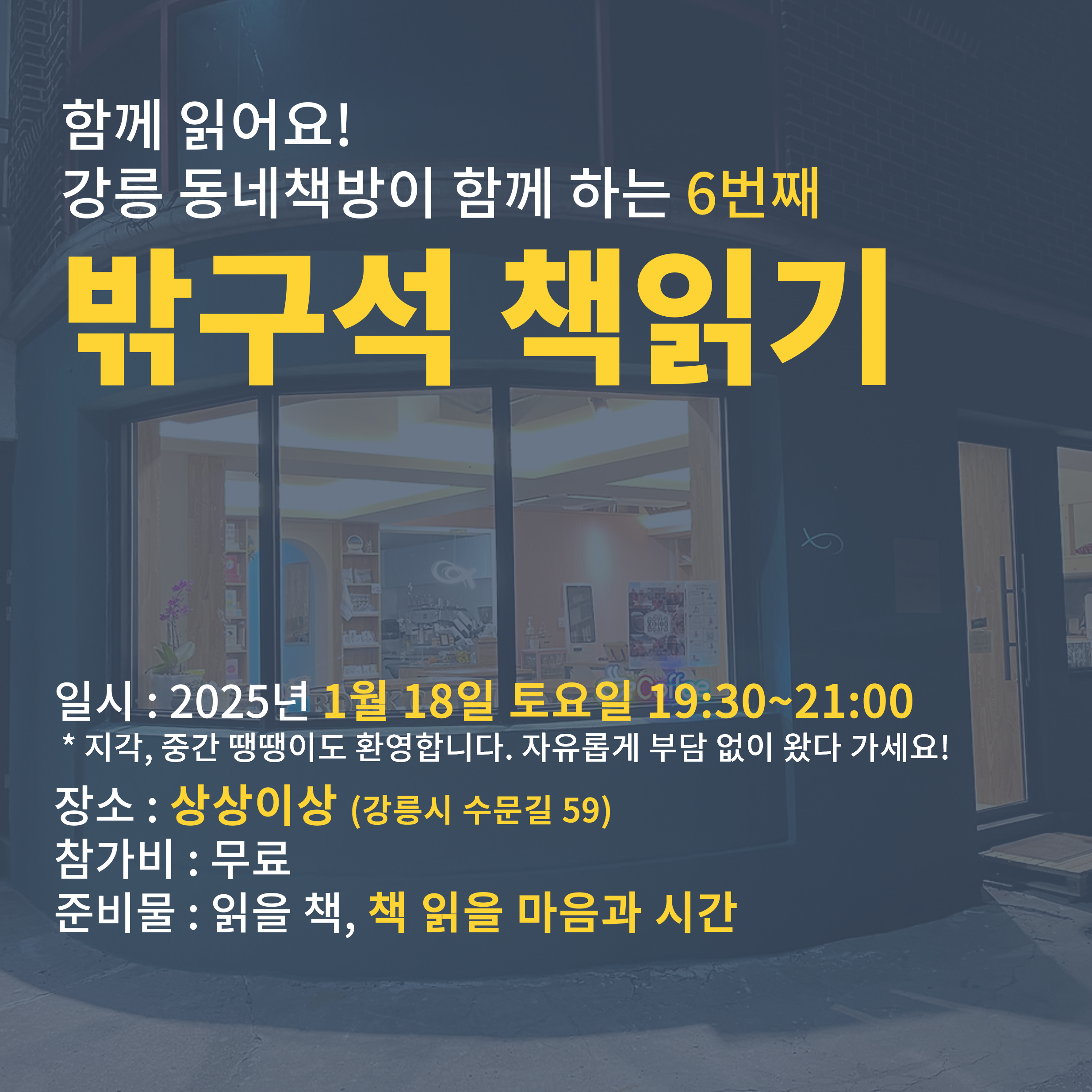 다가오는 1월 18일 토요일 저녁 7시 30분 상상이상에서 게릴라 독서 모임 ’밖구석 책읽기‘를 진행합니다. ’밖구석 책읽기‘는 책 읽는 분위기와 문화를 위해 강릉 몇몇 책방이 모여 진행하는 프로그램입니다. 혼자 책 읽는 게 어렵다면, 다른 이들과 함께 책을 읽어보세요.