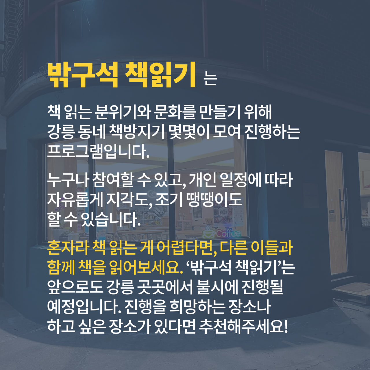 밖구석 책읽기는 책 읽는 분위기와 문화를 만들기 위해 강릉 동네 책방지기 몇몇이 모여 진행하는 프로그램입니다.