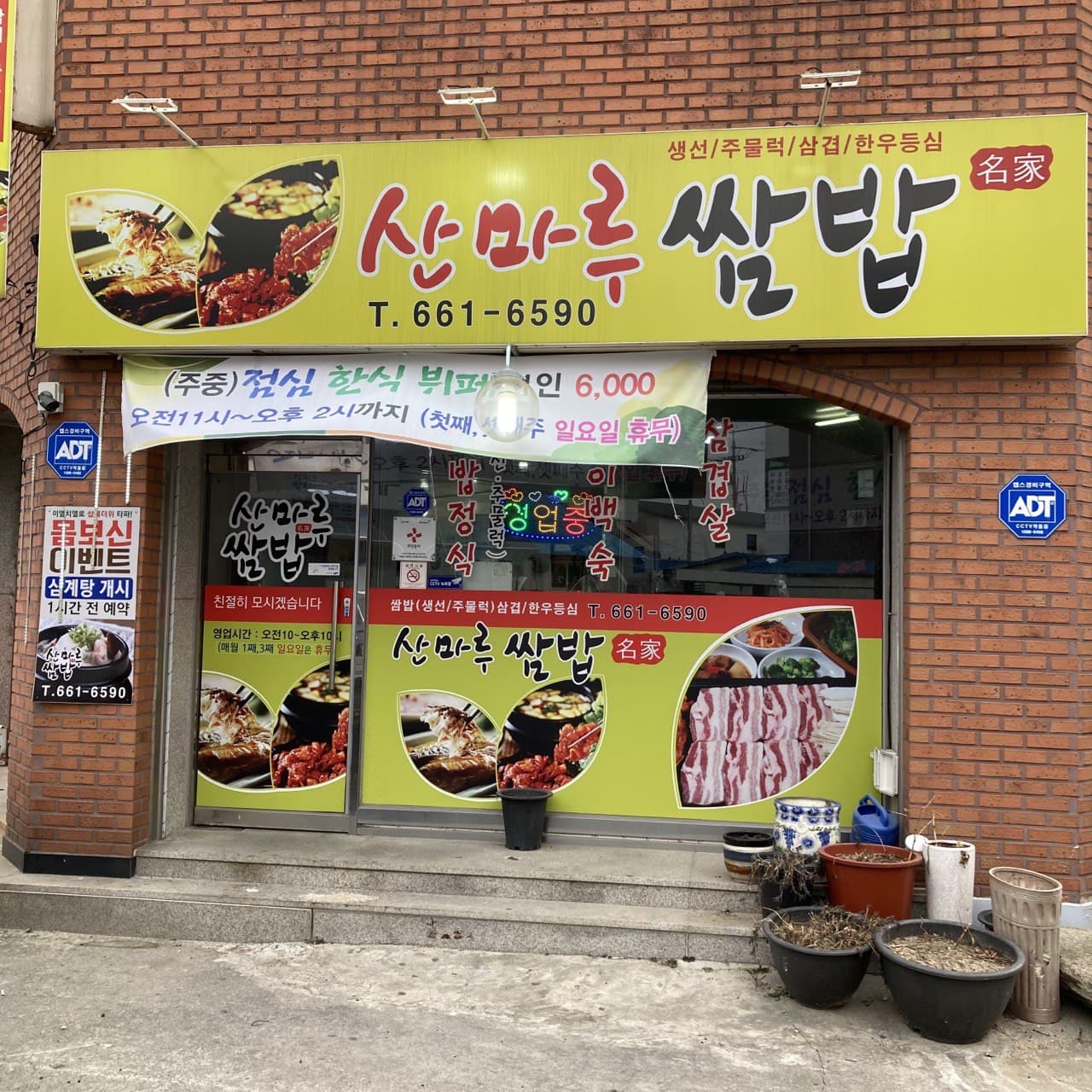 주문진 지역 주민들이 가는 산마루쌈밥. 첩보에 의하면 현재 강다방 건물 1층에서 옛날 산마루 소주방이라는 이름으로 영업을 했는데, 장사가 잘 되어 지금의 옆 건물로 이사갔다고... (강다방 구글 로드뷰를 보면 흔적을 발견할 수 있다) 개인적으로 느끼기에 음식이 심심하지는 않으나(싱겁게 먹는 편이다), 반찬과 음식이 꽤 푸짐하게 나온다. 계란 후라이가 2개 나온다거나, 생선구이 1마리가 통째로 나온다거나, 공기밥을 2개 준다던가 등. 대학생이나 자취생, 오랜 여행으로 영양을 보충해야하는 여행자들이 있다면 추천하는 곳. 주문진에서는 드문, 밤 10시까지 영업한다. 강다방 게스트하우스에서 1분 거리.