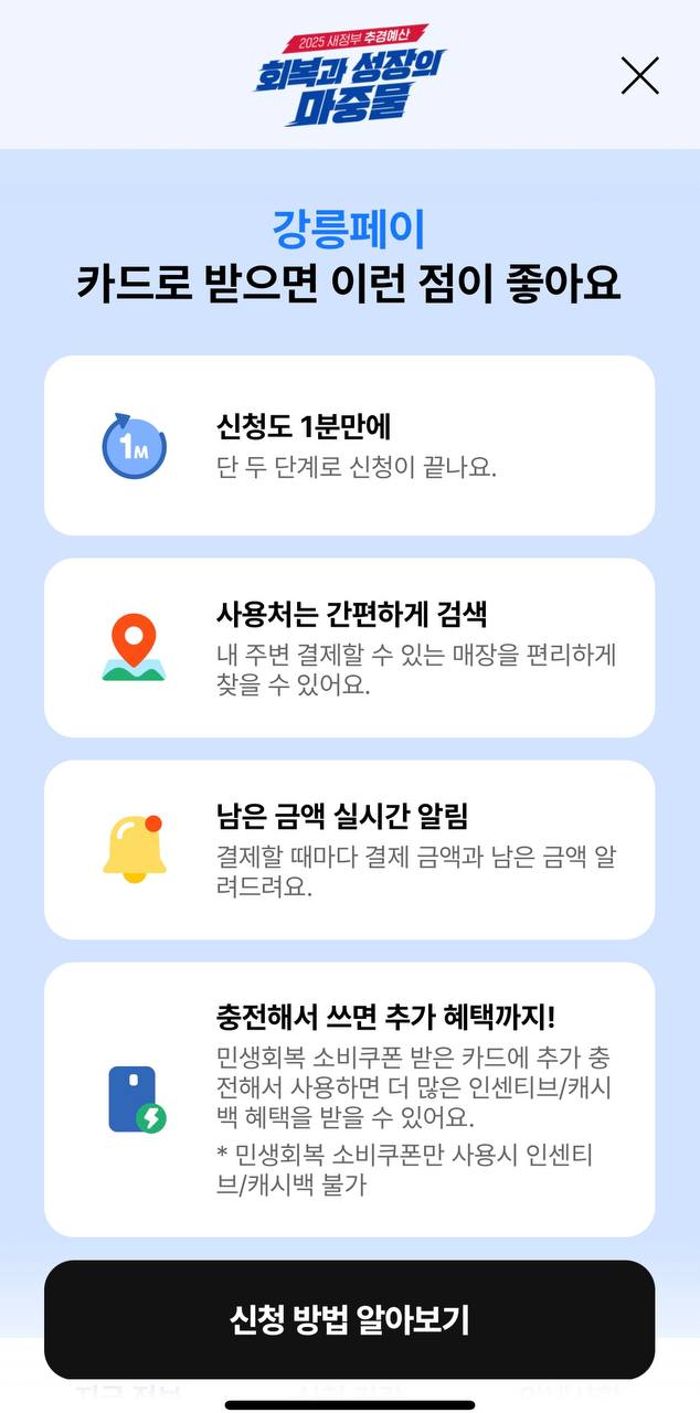 * 강릉페이(강릉 지역화폐)로 민생회복 소비쿠폰 사용 시 인센티브(7월 기준 30만원까지 8% 캐시백)는 제공되지 않습니다. 본인 충전 금액에 대해서만 인센티브 적용됩니다.