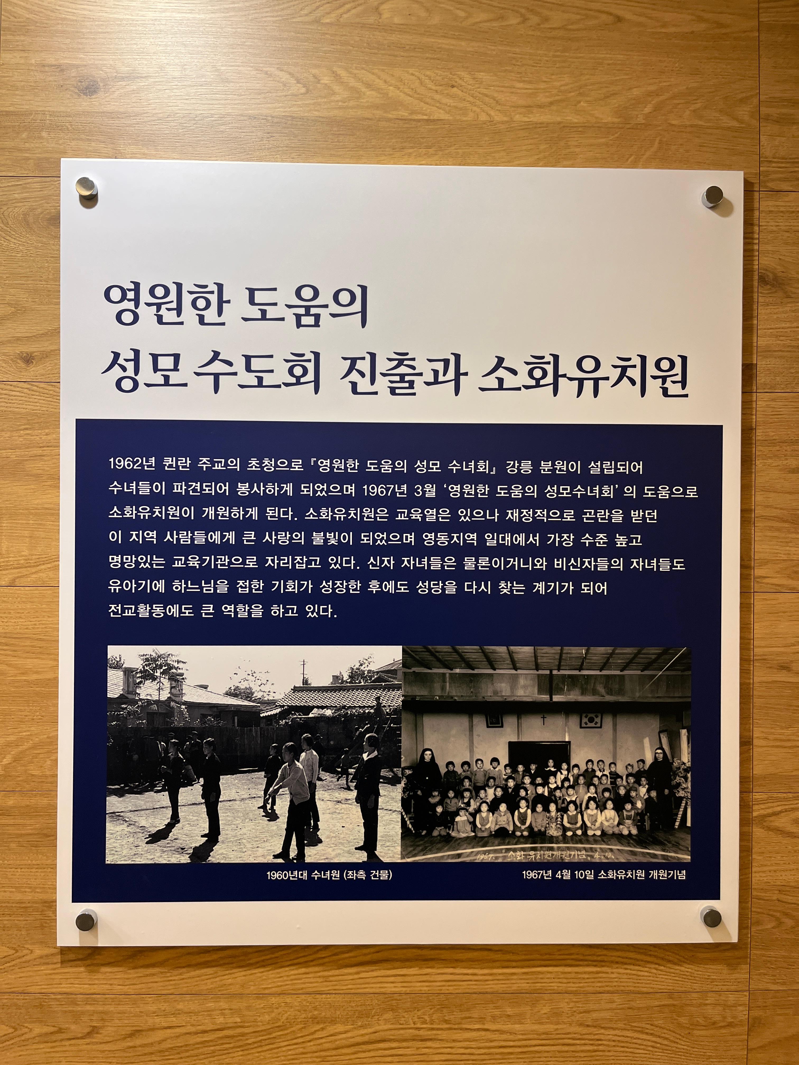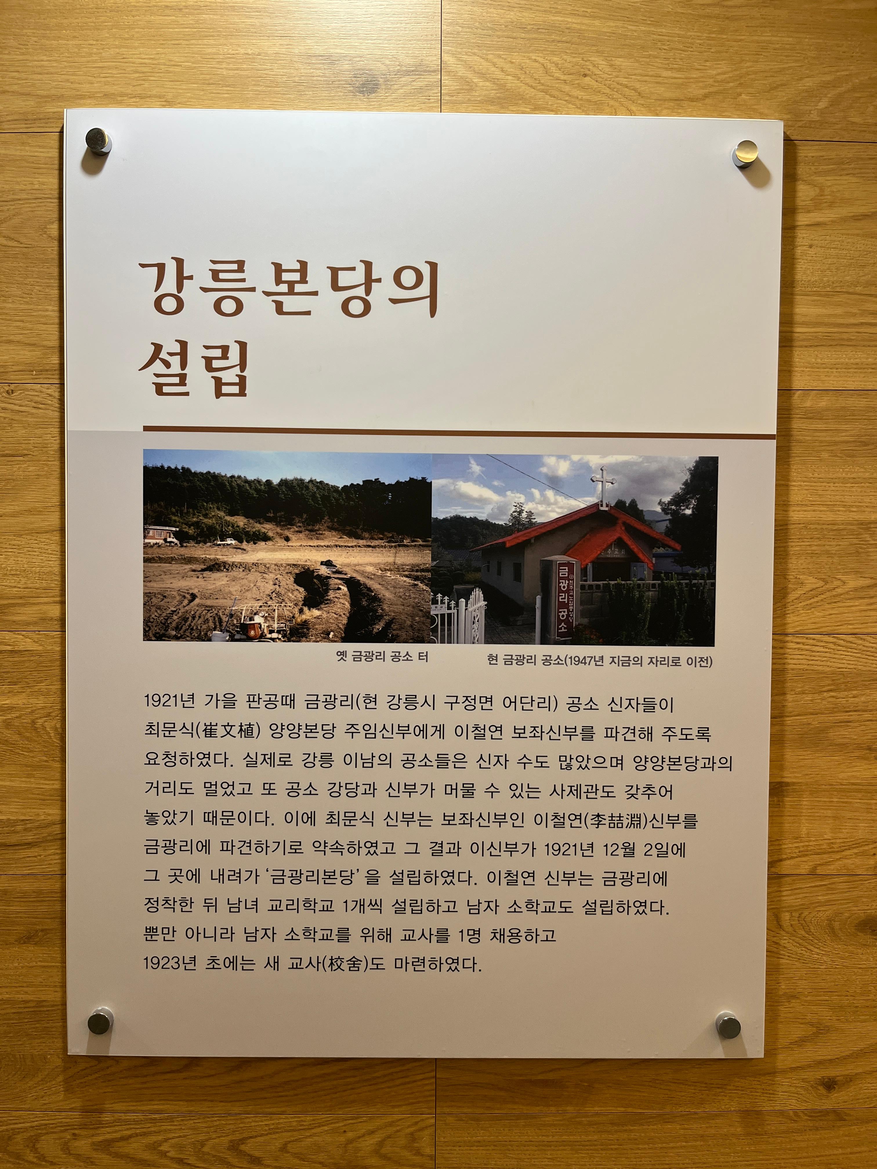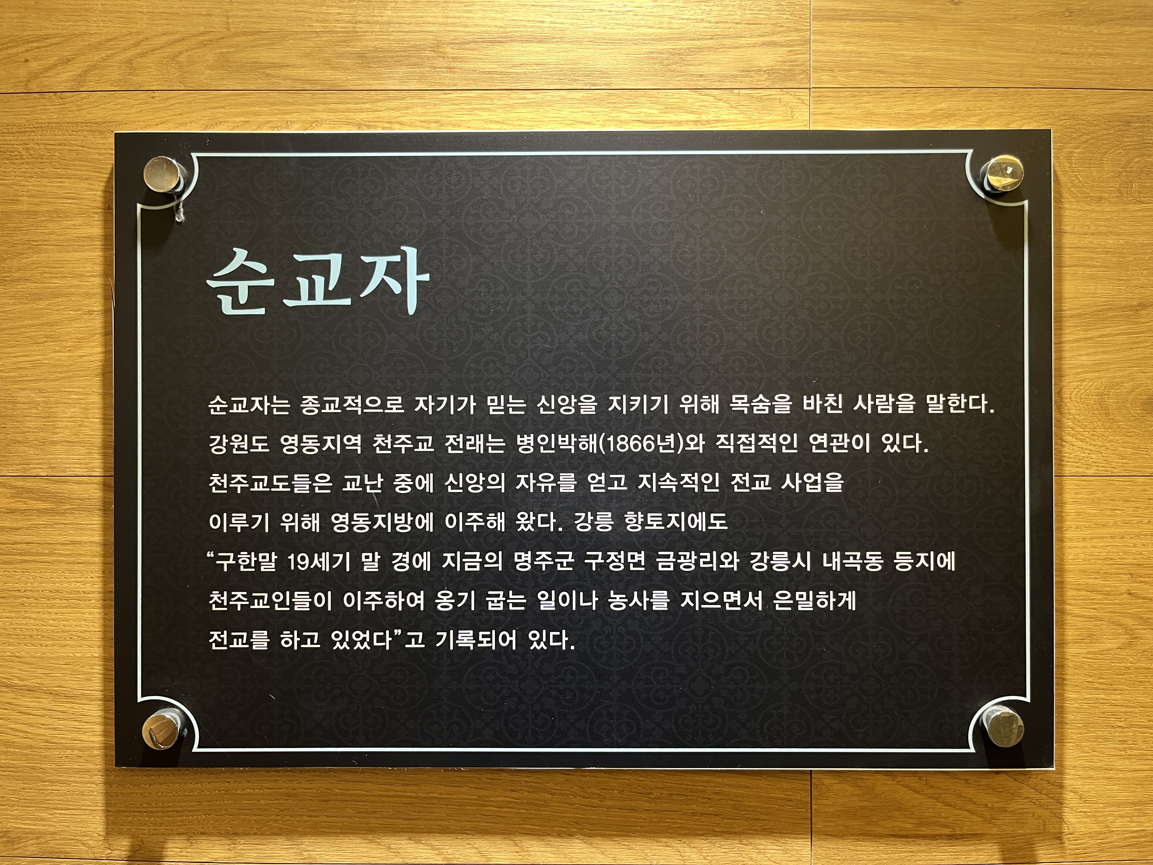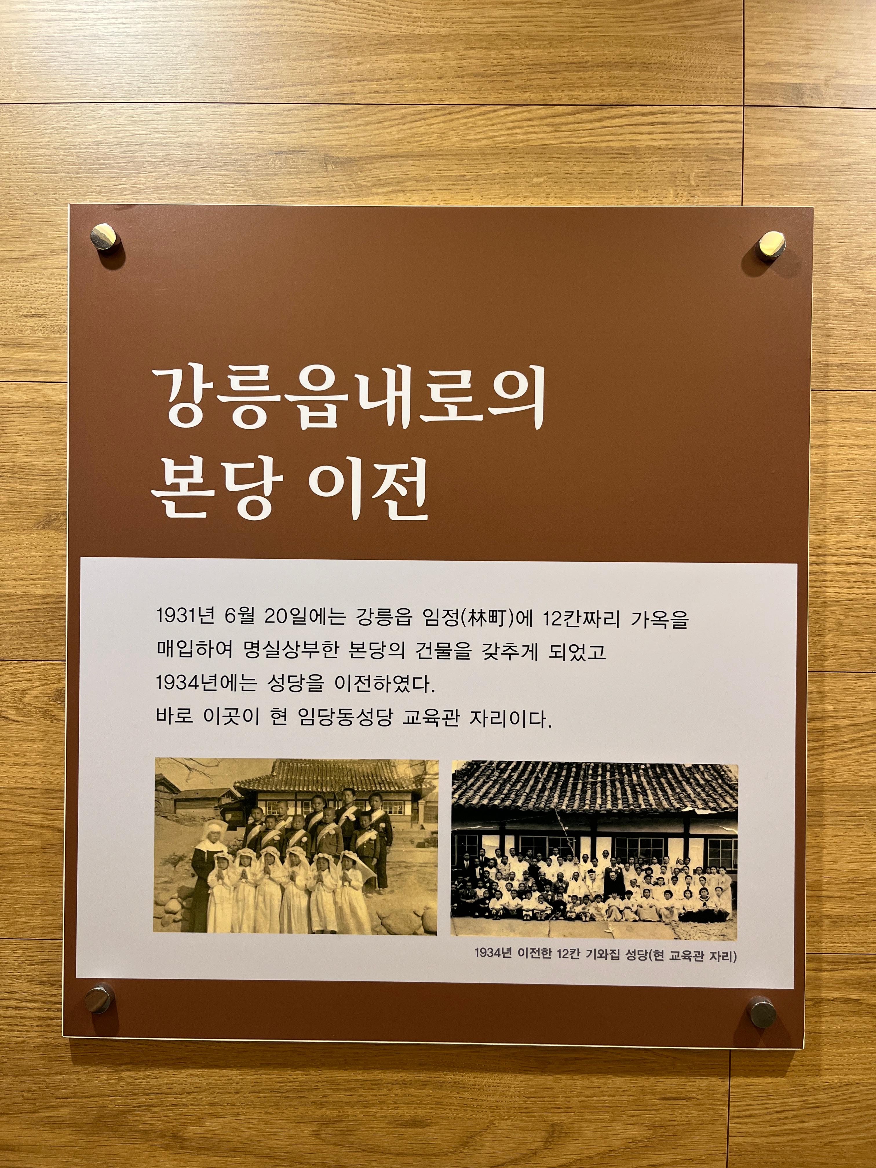 임당동성당 옆 건물에 있는 가톨릭역사박물관. 강릉 지역 가톨릭 역사에 대한 설명과 유물이 잘 정리되어 있다. 1층 사무실에 방문해 말씀드리면 전시실 문을 열어주시며, 월요일과 화요일은 휴무일, 점심 시간 등을 잘 피해서 가야 한다.
