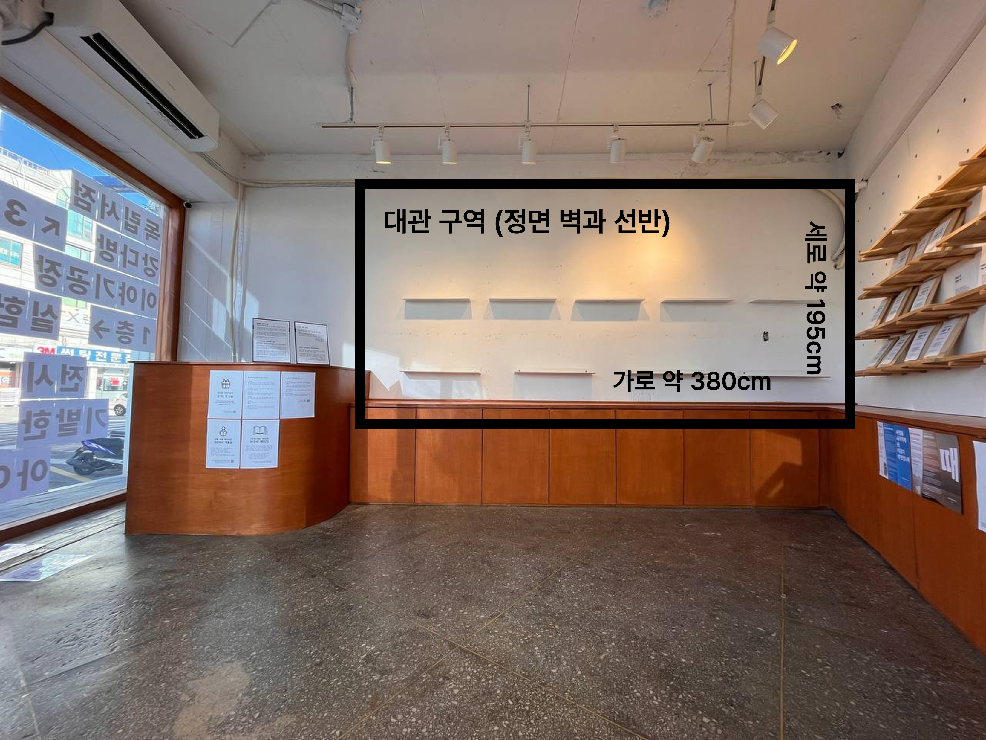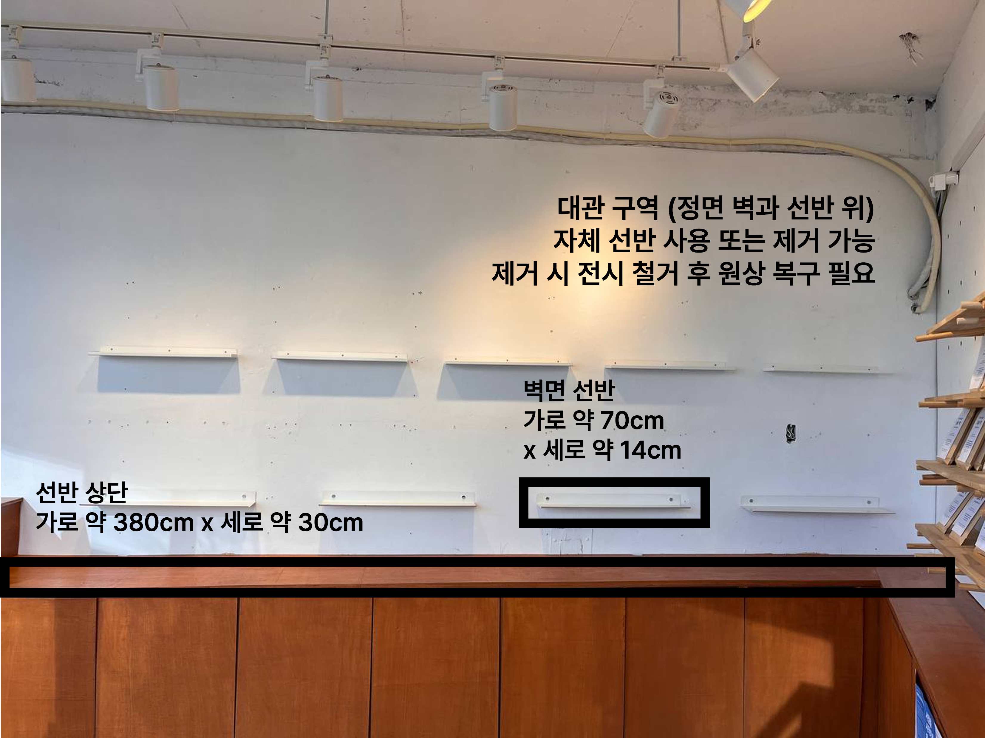 · 기존에 설치된 벽면 선반 이용 또는 제거 가능. 제거시 전시 철거 후 원상 복구 필요