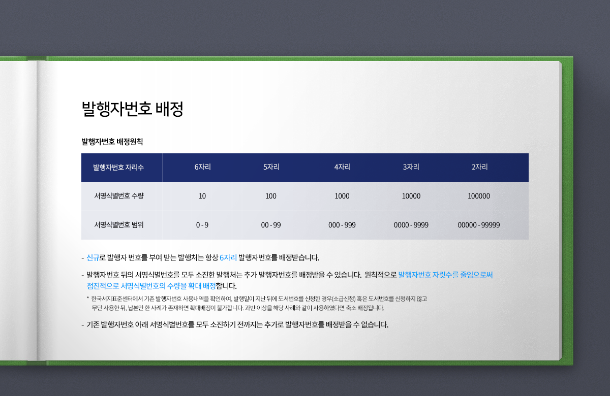 발행자번호 뒤 서명식별번호를 모두 소진한 발행처는 추가 발행자번호를 배정받을 수 있음.