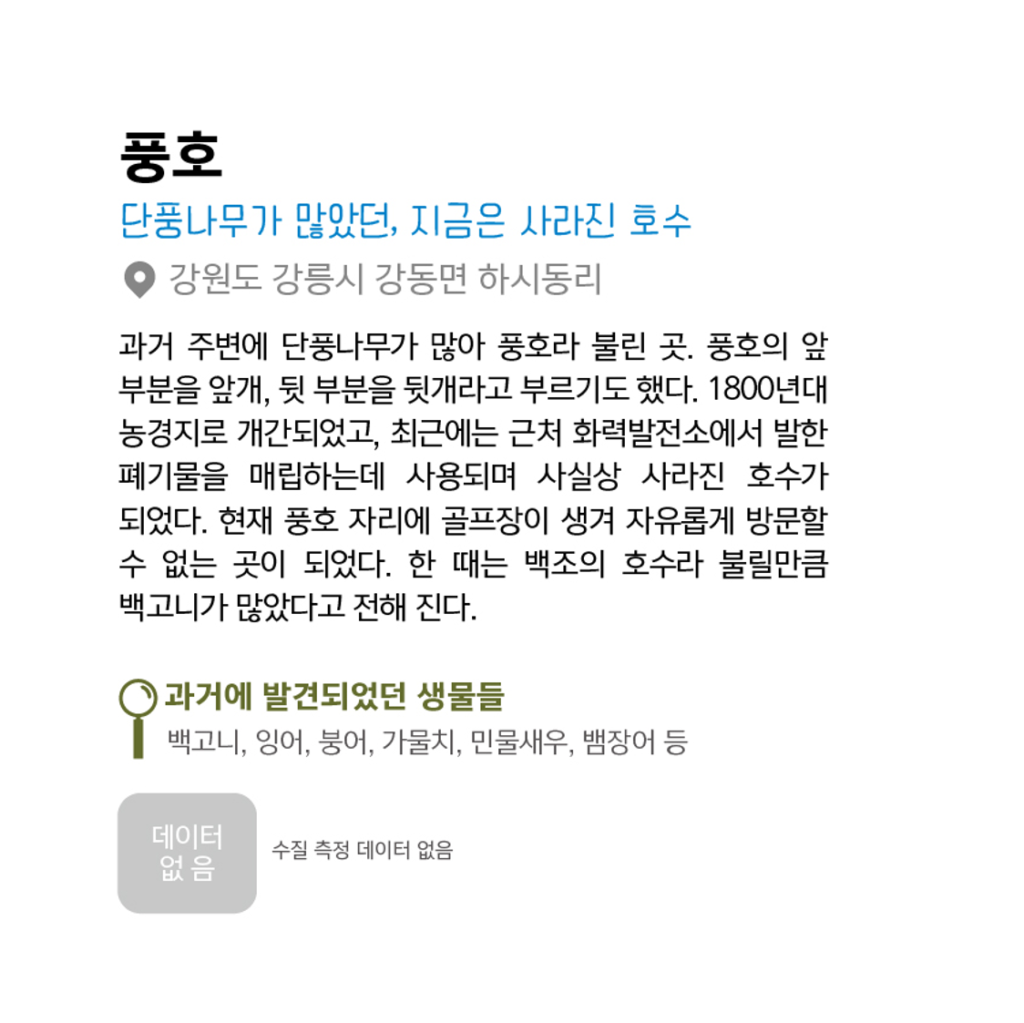 과거 주변에 단풍나무가 많아 풍호라 불린 곳. 풍호의 앞 부분을 앞개, 뒷 부분을 뒷개라고 부르기도 했다. 1800년대 농경지로 개간되었고, 최근에는 근처 화력발전소에서 발생한 폐기물을 매립하는데 사용되며 사실상 사라진 호수가 되었다. 현재 풍호 자리에 골프장이 생겨 자유롭게 방문할 수 없는 곳이 되었다. 한 때는 백조의 호수라 불릴만큼 백고니가 많았다고 전해진다.