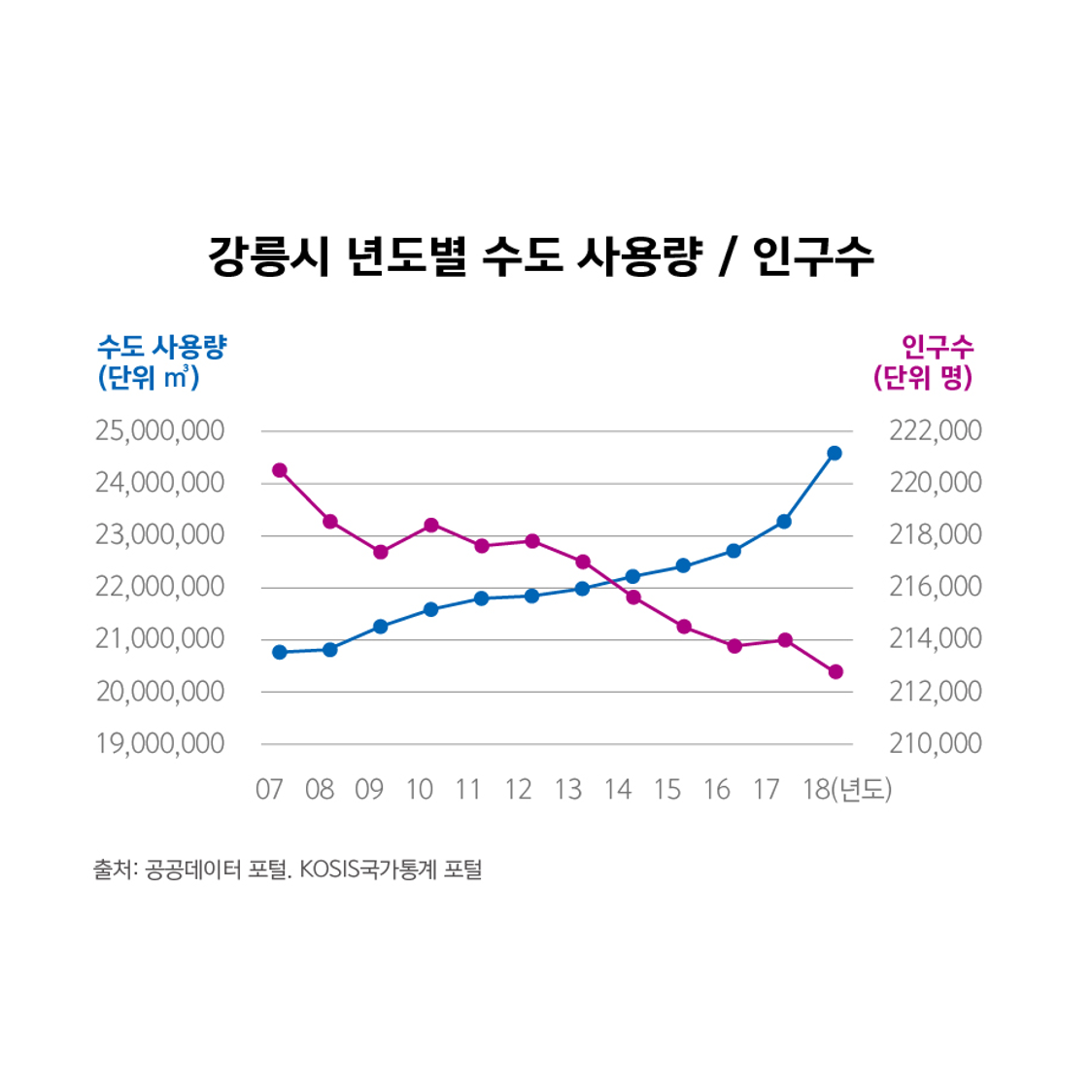 2018년 : 수도 사용량 합계 24,698,898㎥ / 강릉시 인구 212,957명