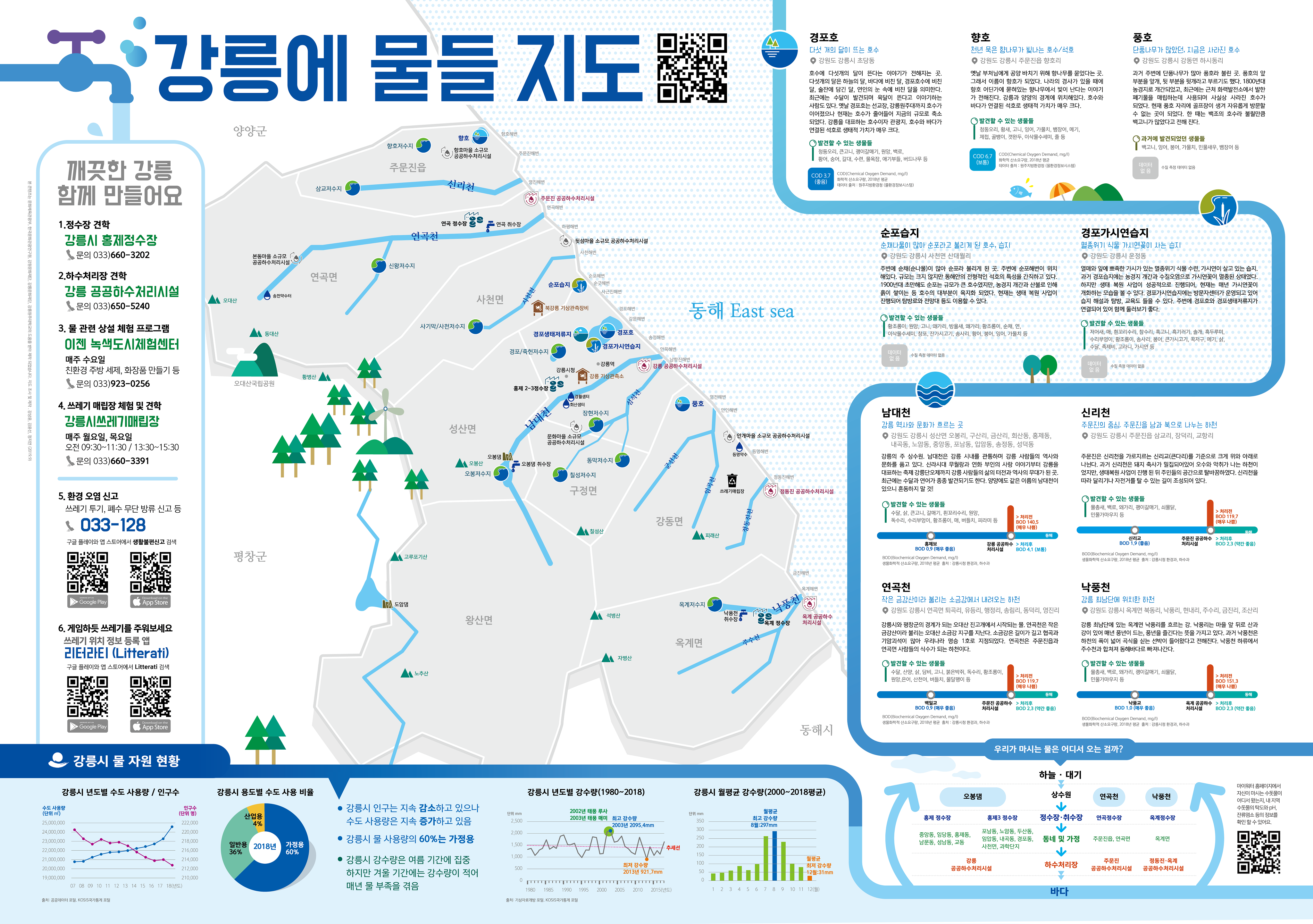 강릉에 물들 지도 강동원(강릉 동네 물자원) 찾기 프로젝트 강릉은 산과 바다, 하천, 석호, 습지 등 물과 관련된 생태자원이 풍부한 도시입니다. 하지만 바다와 비교하여 상대적으로 하천과 석호 등 물 자원에 대한 관심은 높지 않은 편입니다. 물은 지역 주민들의 생활과 건강은 물론 산업과 관광 등 다양한 분야와 결합하여 사회와 경제에 영향을 미칩니다. 강릉에 물들 지도는 강릉 지역의 하천, 석호, 습지 등 물 자원을 정리하여 데이터화, 시각화, 콘텐츠화 한