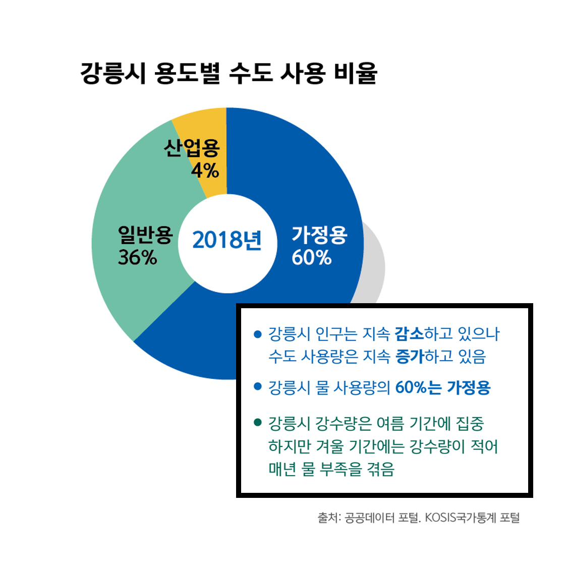 강릉시 인구는 지속 감소하고 있으나 수도 사용량은 지속 증가하고 있음. 강릉시 물 사용량의 60%는 가정용