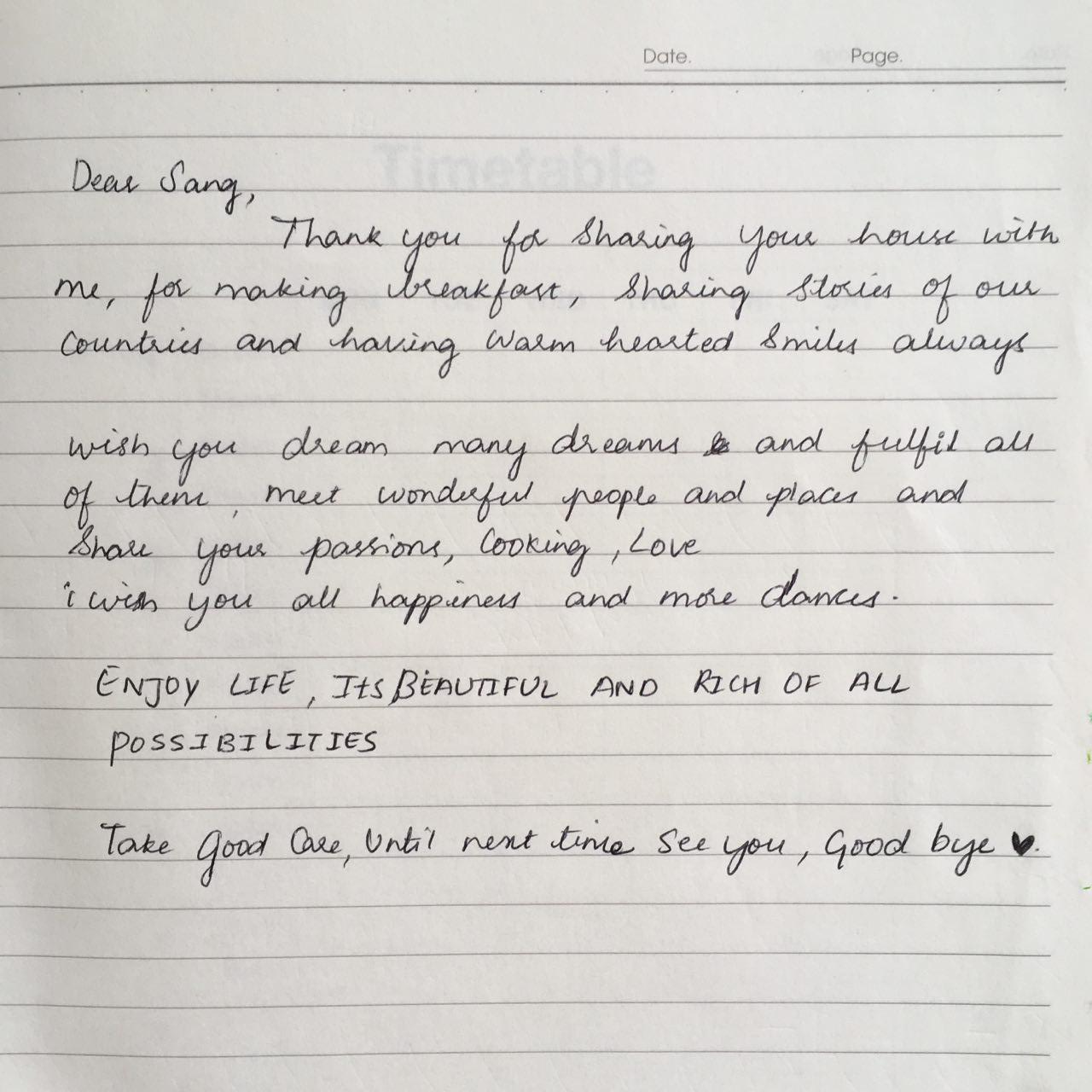 Thank you for sharing your house with me, for making breakfast, Sharing stories of our countries and having warm hearted smiles always