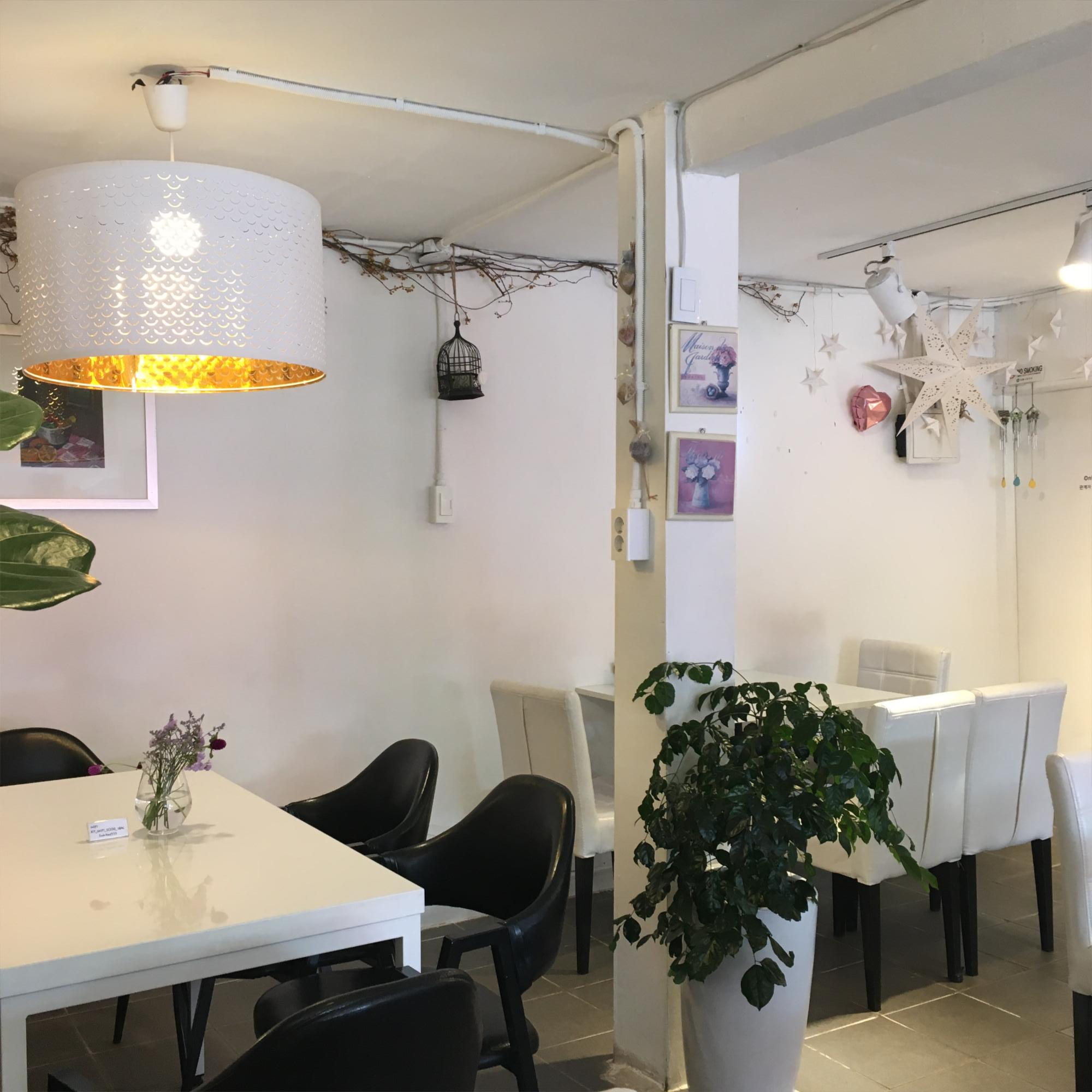 강릉 월화거리에 위치한 하얀색 카페. 겉에서 보기에는 작아 보일 수 있지만 내부에 좌석이 꽤 많이 있다. 카페 내부에 휴대폰을 충전할 수 있는 충전기가 비치되어있다.