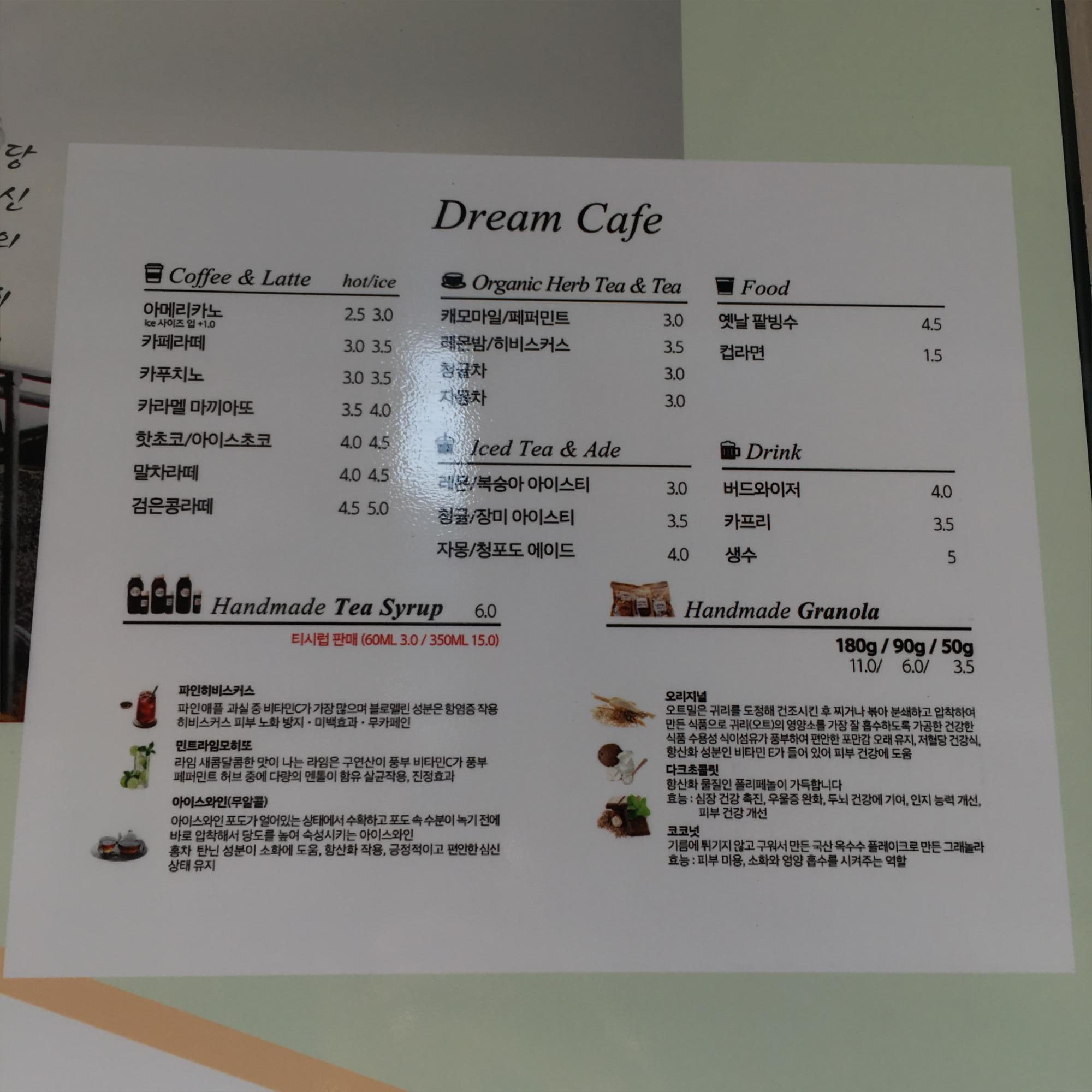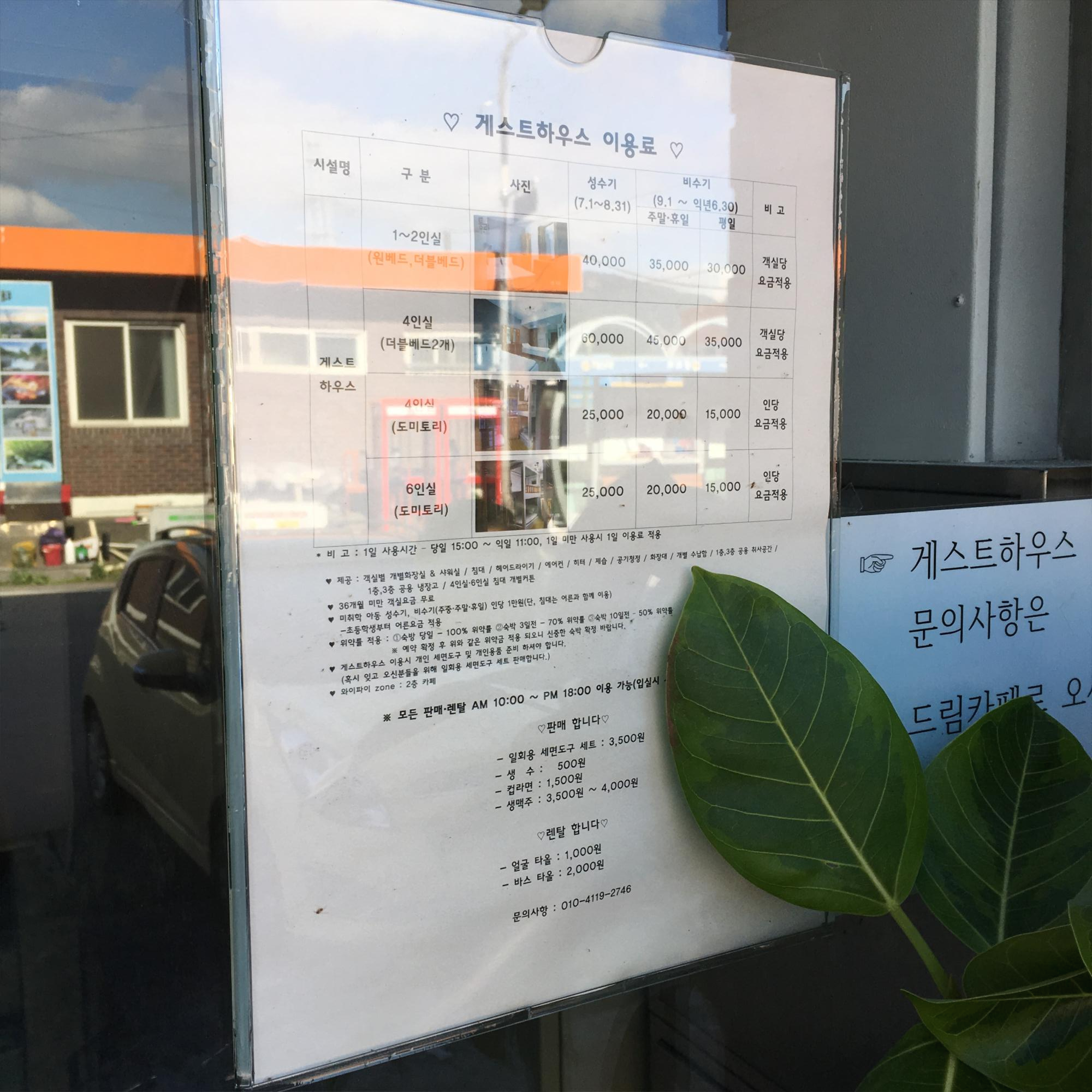 통리 게스트하우스 1층에 위치한 카페 메뉴판