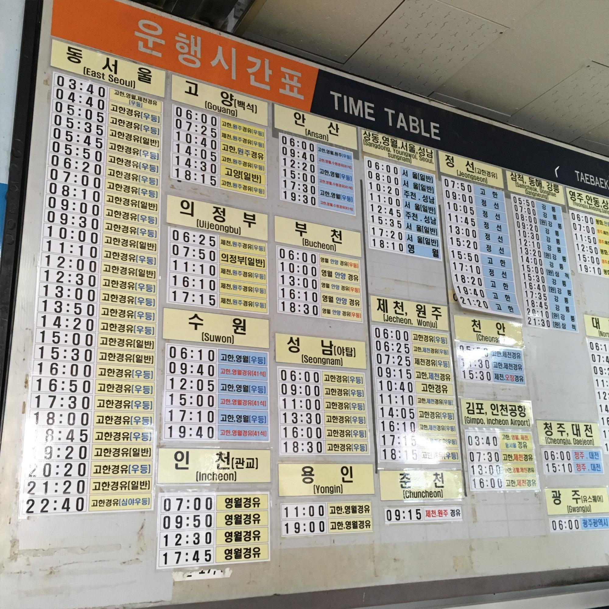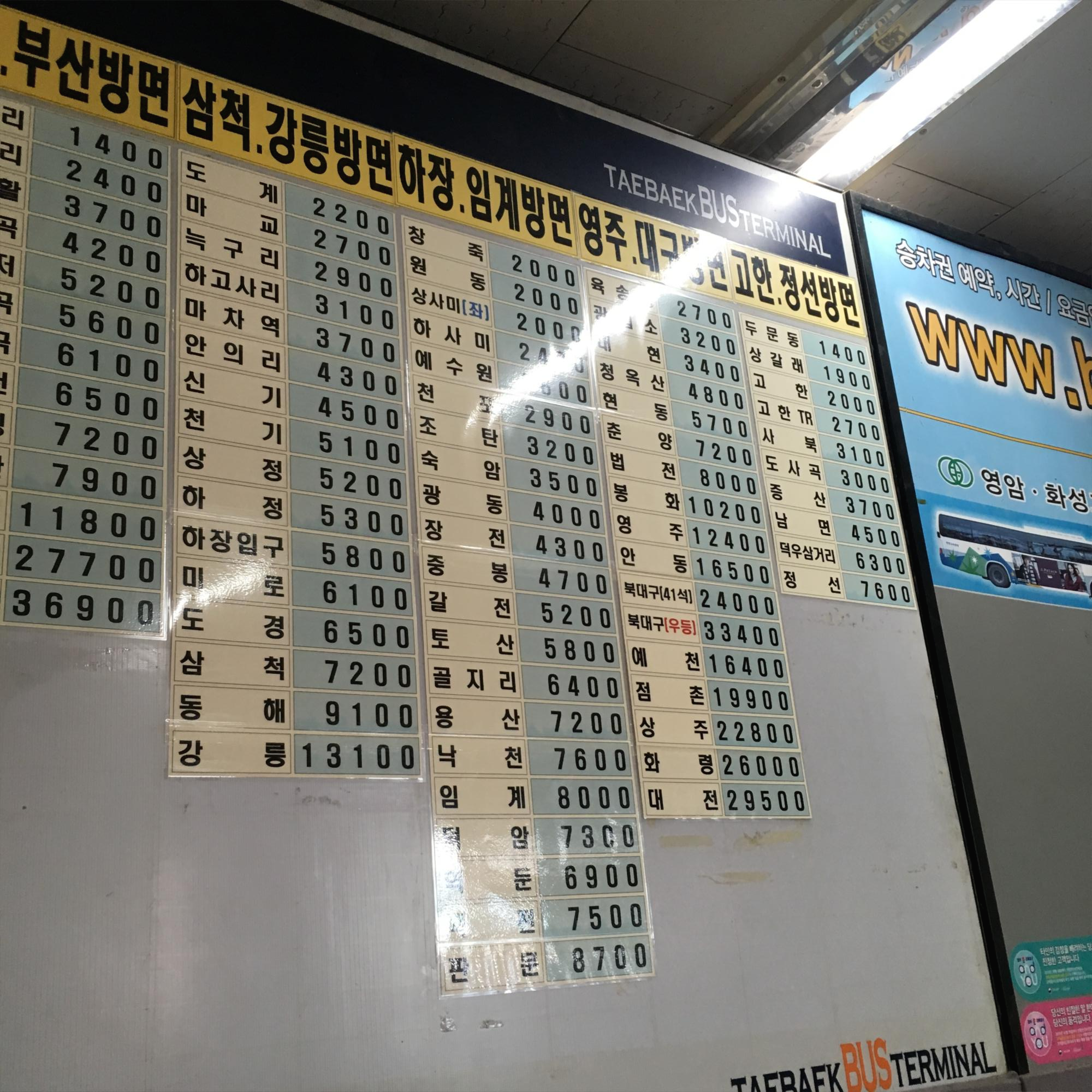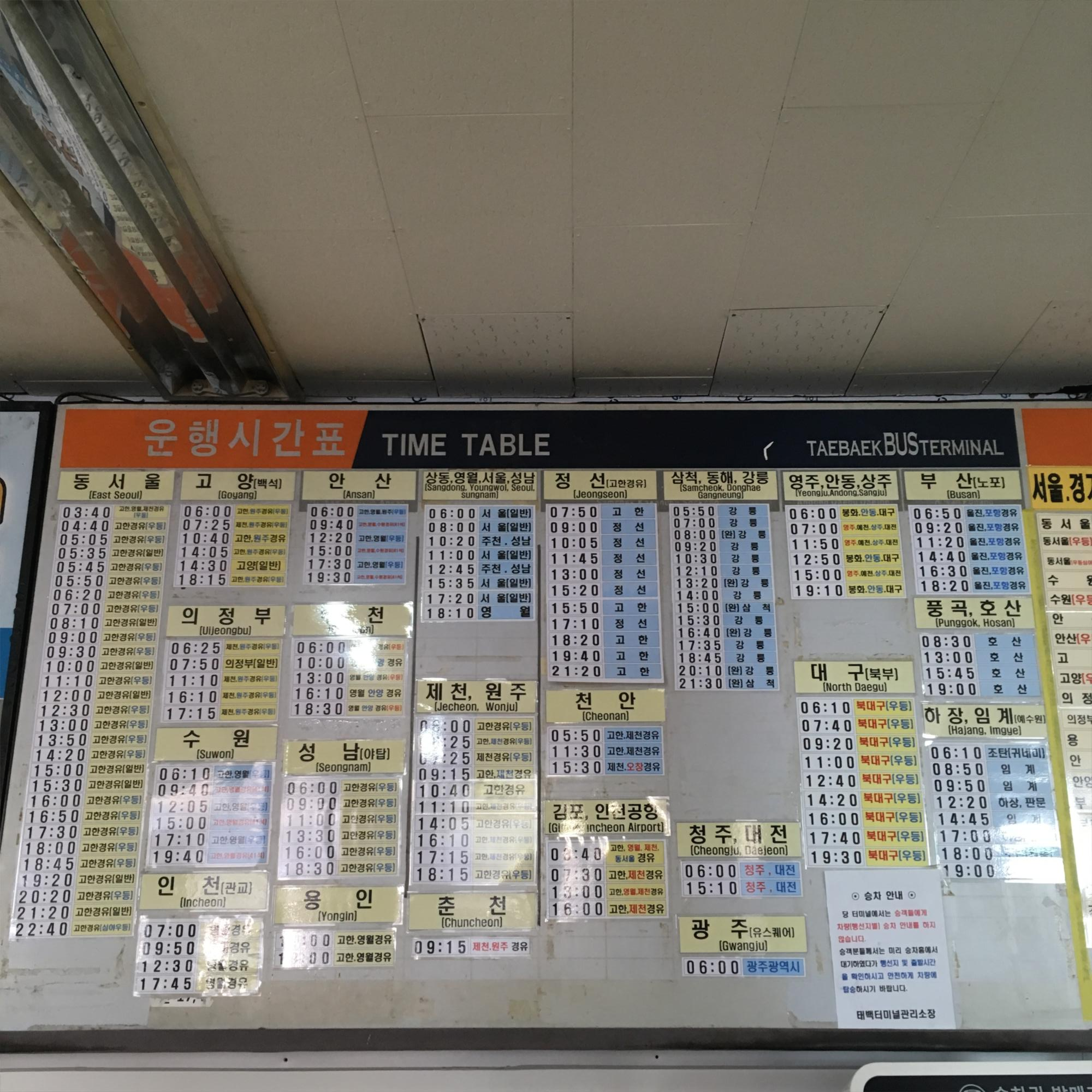 옛날 느낌이 물씬나는 태백버스 정류장. 장기 둘 때 봤던 것 같은 글씨체입니다. 태백 버스터미널에서는 서울과 정선, 강릉, 대구 등으로 가는 버스 노선이 있습니다. 시골(?) 살면서 한 가지 알게된 사실은 다른 도시와 비교하여 어디든 서울로 가는 교통편이 가장 저렴하다는 점입니다.