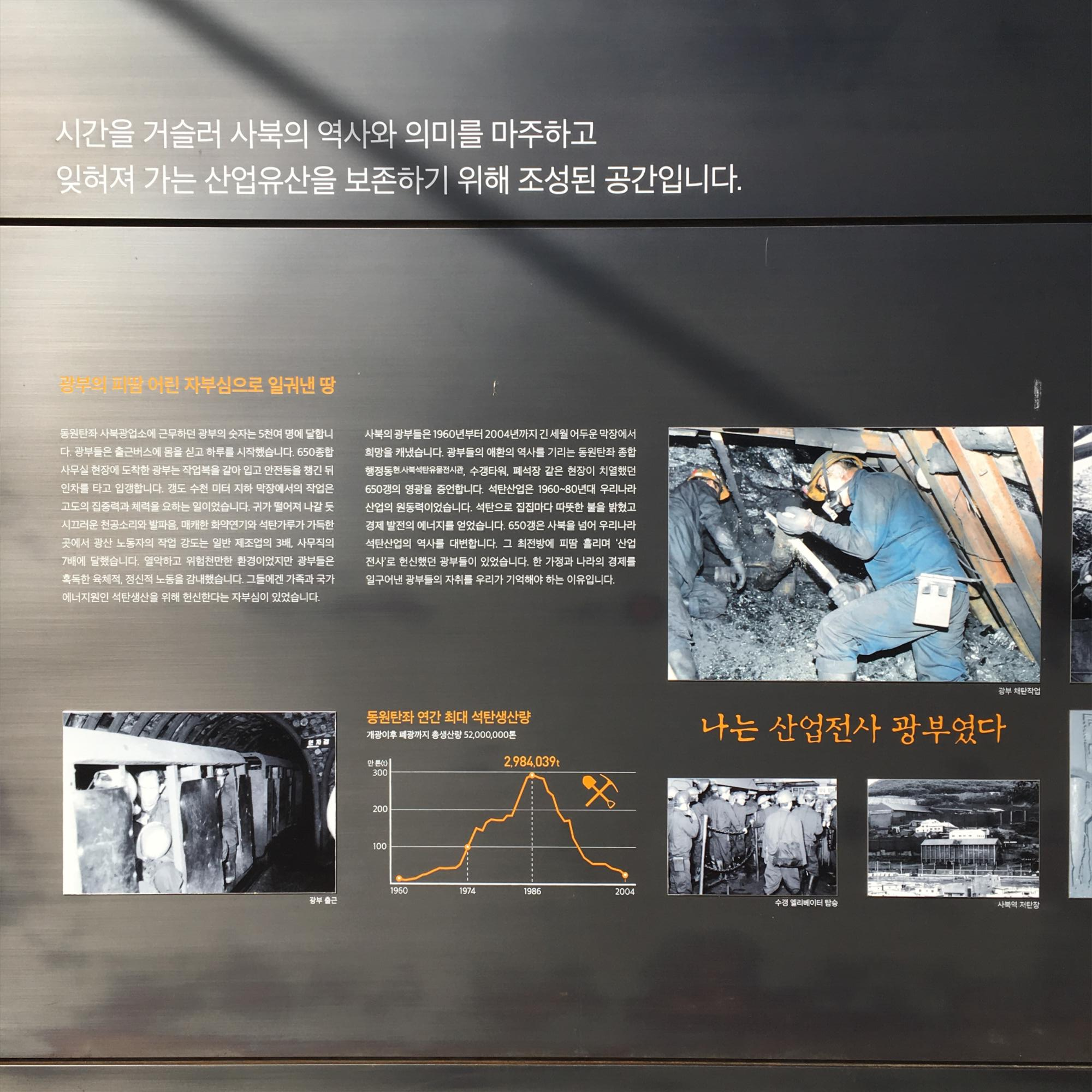 사북의 광부들은 1960년부터 2004년까지 긴 세월 어두운 막장에서 희망을 캐냈습니다. 광부들의 애호나의 역사를 기리는 동원탄좌 종합 행정동(현 사북석탄유물전시관), 수갱타워, 폐석장 같은 현장이 치열했던 650갱의 영광을 증언합니다. 석탄산업은 1960~80년대 우리나라 산업의 원동력이었습니다. 석탄으로 집집마다 따뜻한 불을 밝혔고 경제 발전의 에너지를 얻었습니다. 650갱은 사북을 넘어 우리나라 석탄산업의 역사를 대변합니다. 그 최전방에 피땀 흘리며 '산업전사'로 헌신했던 광부들이 있었습니다. 한 가정과 나라의 경제를 일구어낸 광부들의 자취를 우리가 기억해야 하는 이유입니다.