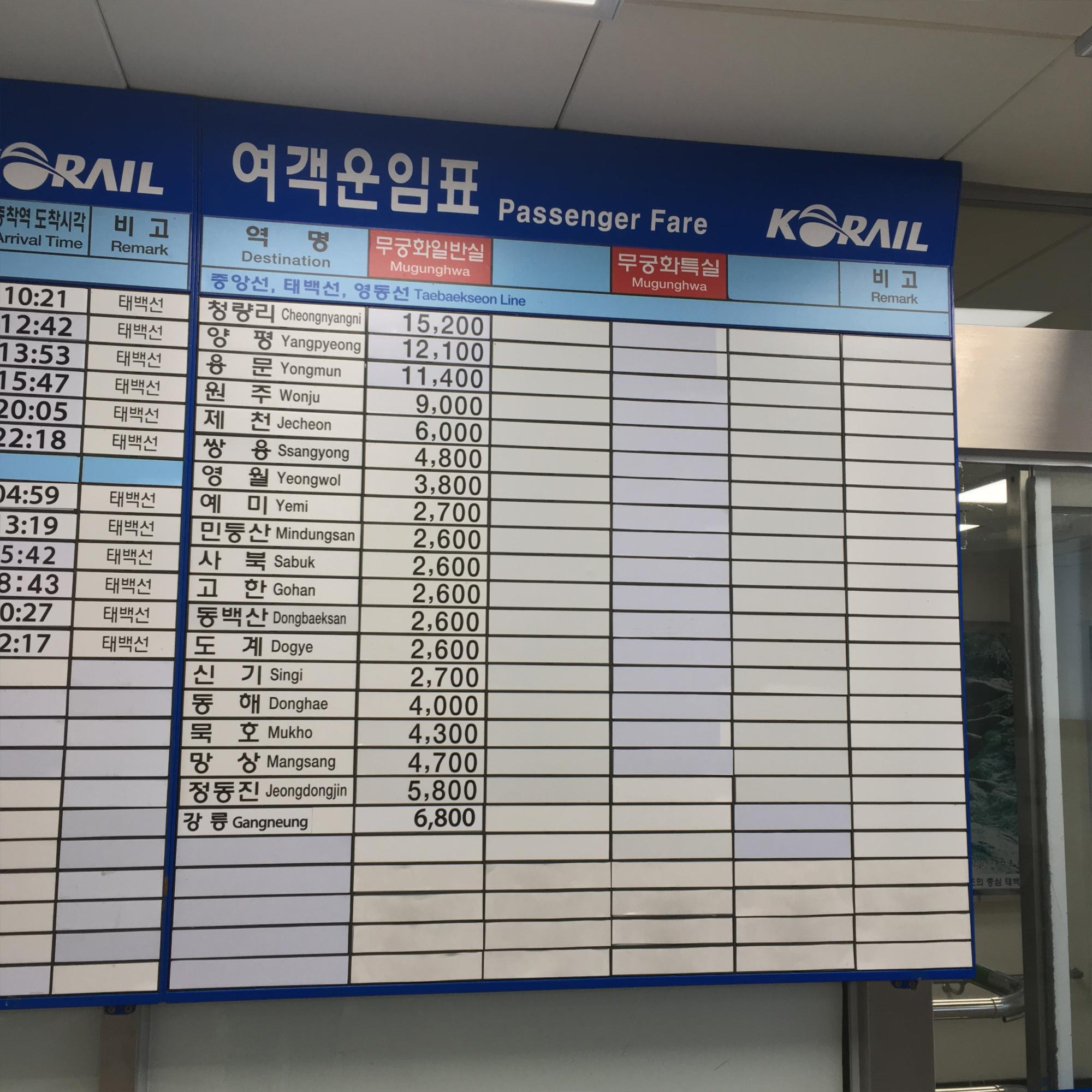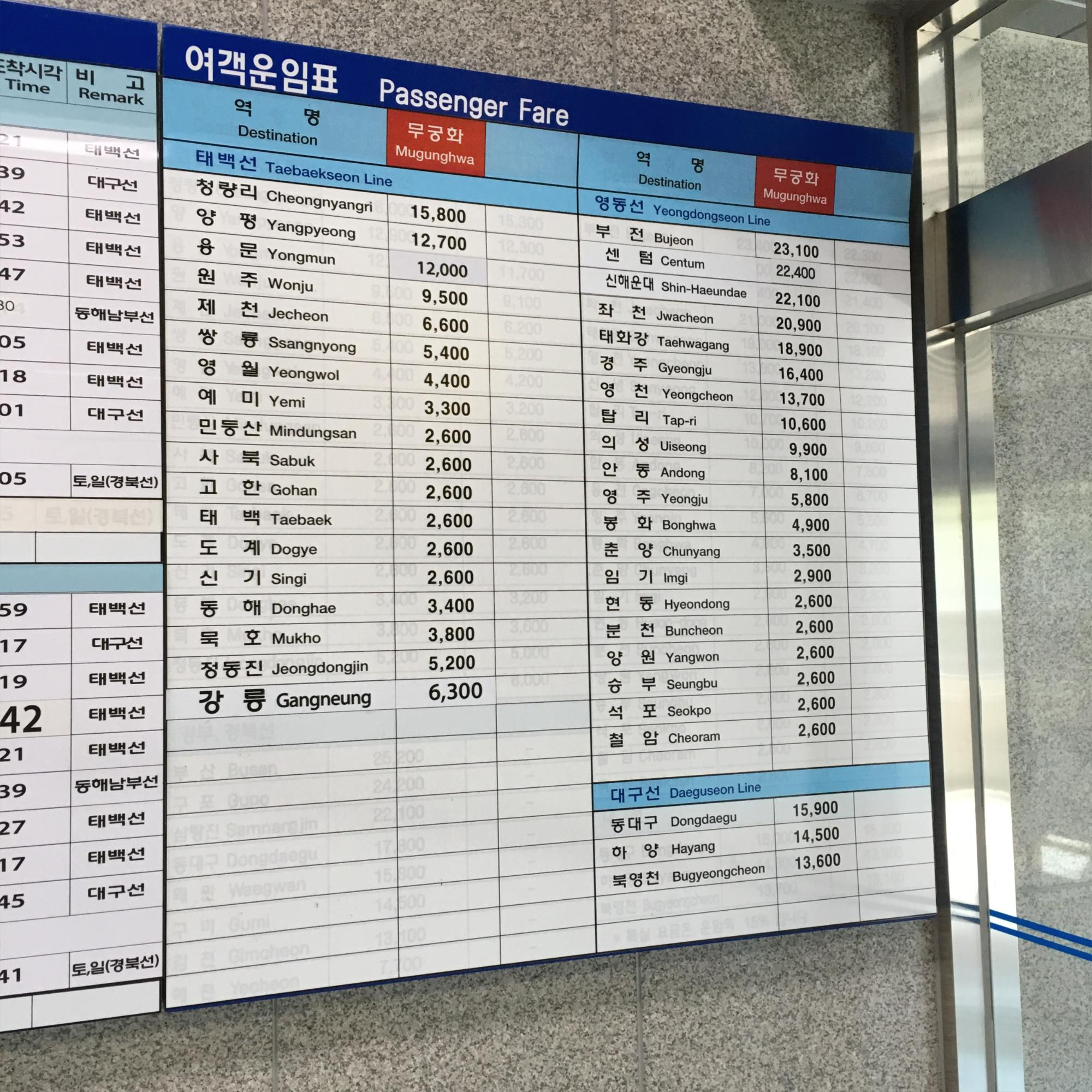 태백역 열차 운임표