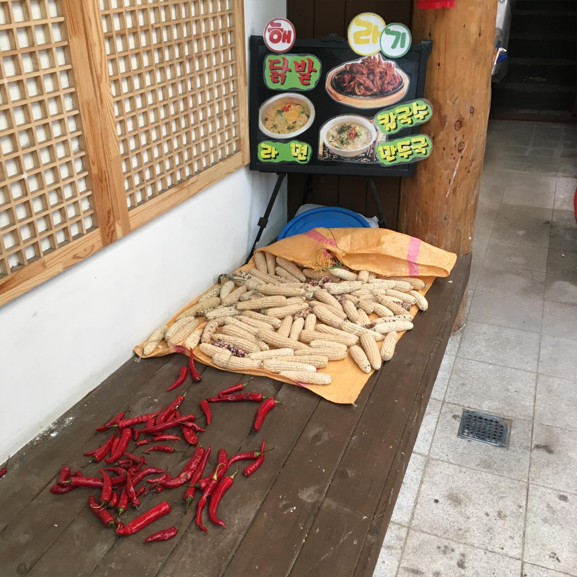 아리아리 정선 사북시장의 입구. 시장 한 편에서 고추와 옥수수를 말리고 있습니다. 강원도답게 곤드레 나물도 있습니다. 태백산맥을 중심으로 영서지방에서는 옥수수를 옥시기로, 영동지방에서는 옥시끼로 부른다고 들었습니다.