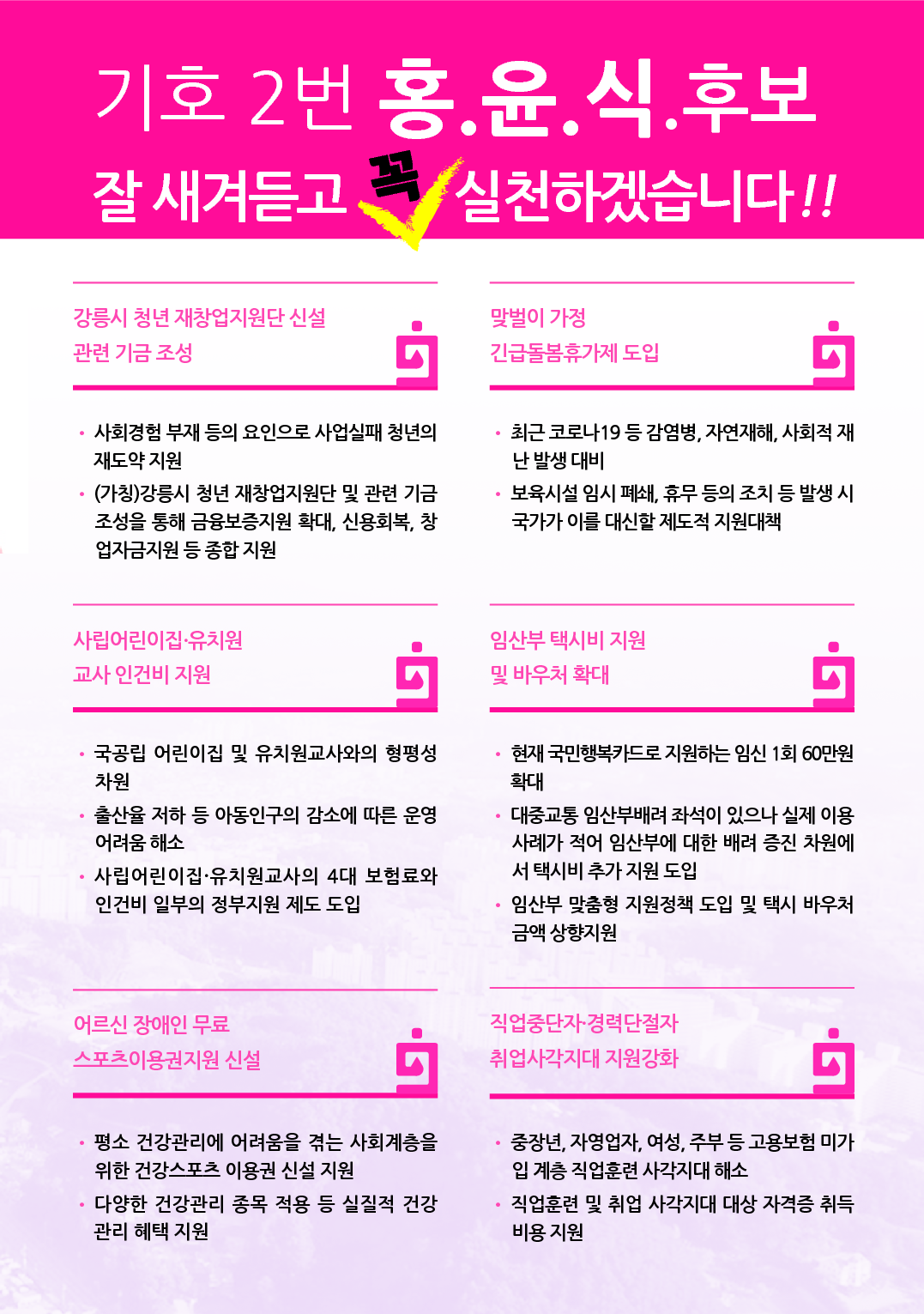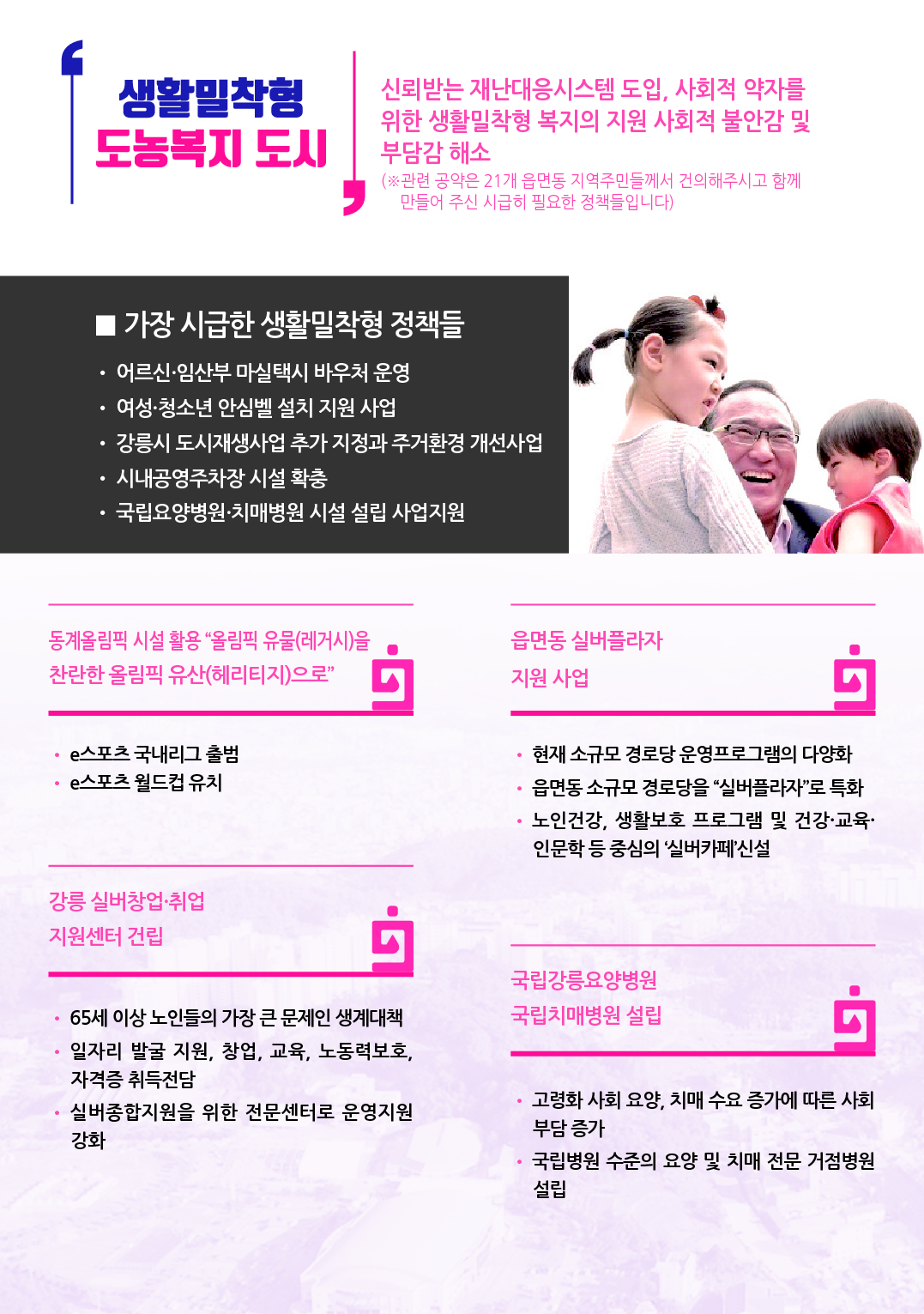 (※ 관련 공약은 21개 읍면동 지역주민들께서 건의해주시고 함께 만들어 주신 시급히 필요한 정책들입니다)