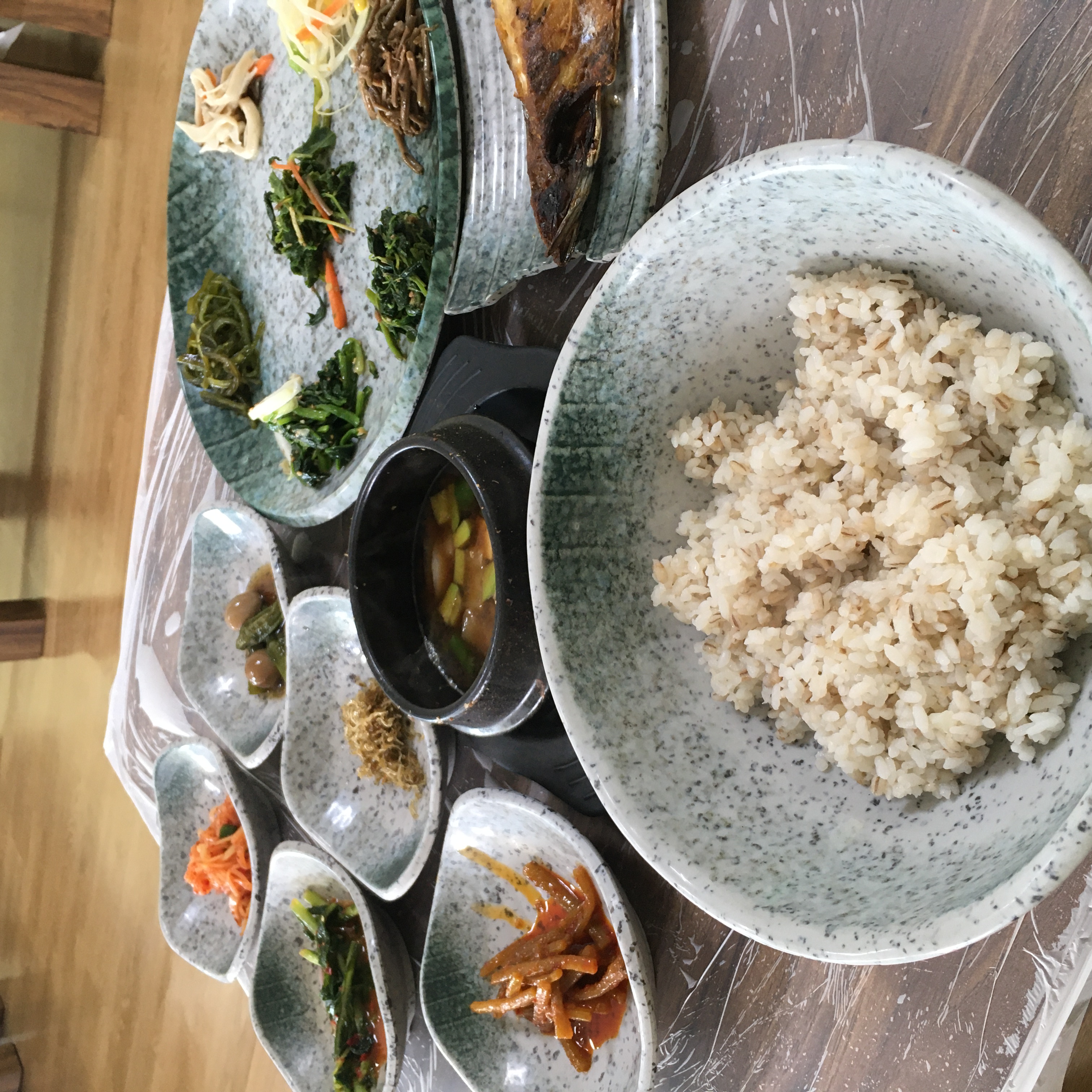 주문진 읍사무소 근처에 위치한 보리밥집. 기본 반찬으로 된장찌개와 구운 생선이 나오며 식탁마다 참기름병이 놓여있다.