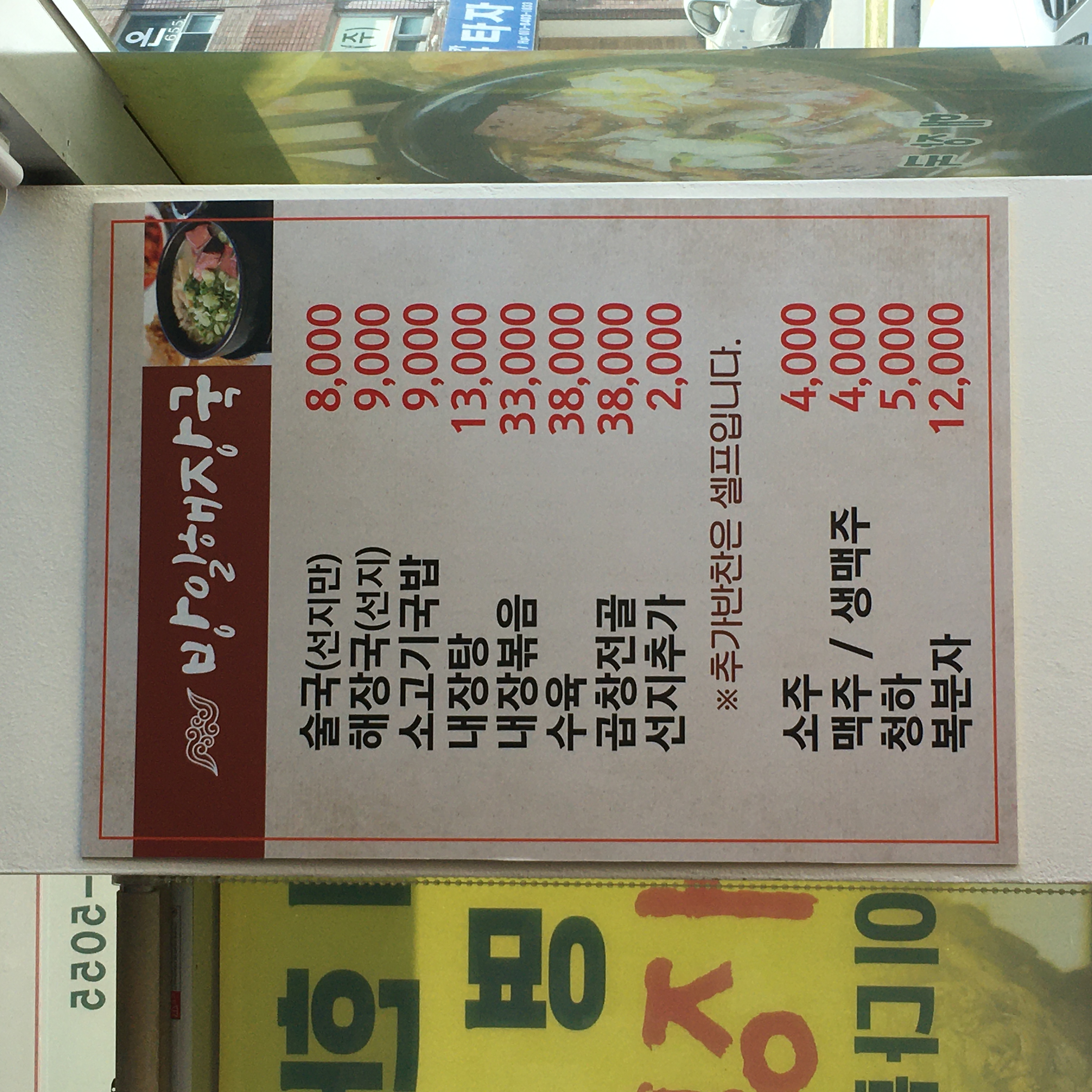 매주 월요일 휴무 Closed Every Monday 메뉴 및 가격 Menu with Prices :술국(선지) Sulguk Beef Blood Only Hangover Soup 8,000원