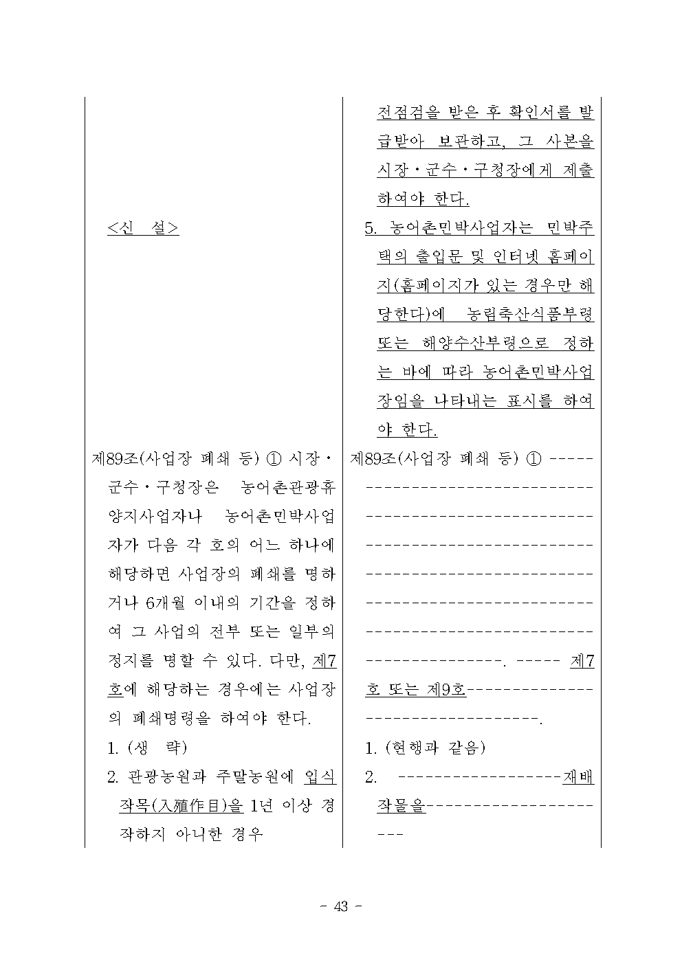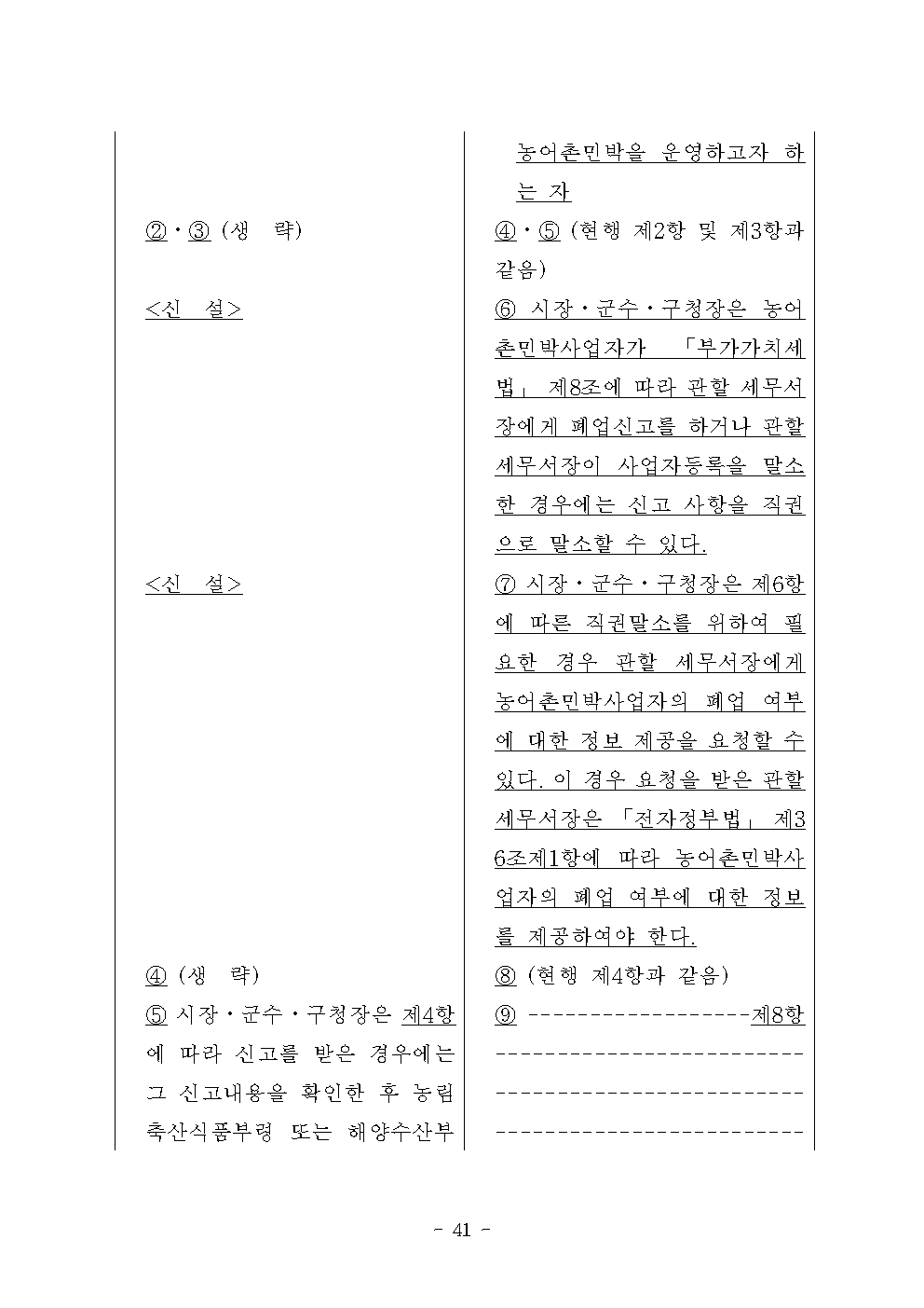 다. 농어촌민박의 신고 요건을 강화하고 농어촌민박사업자의 준수사항을 추가함(안 제86조, 제86조의2 및 제89조제1항 등).