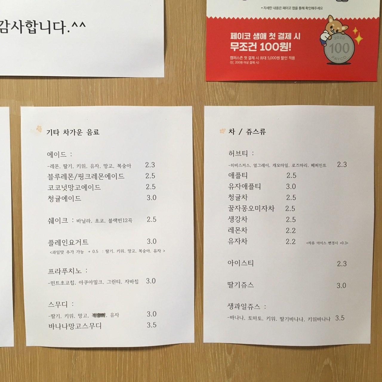 강릉원주대 캠퍼스 안에 있는 카페. 강릉원주대 소비자생활협동조합에서 운영하는 카페라 가격이 저렴하다. 기본적으로 휘핑은 포함되지 않은 가격이며, 휘핑 추가시에는 500원이 추가 된다. 카페는 오후 6시에 문을 닫지만, 휴게실은 밤 10시까지 이용 가능하다. 도서관과 학생회관에 있는데 전망이나 규모는 학생회관 쪽이 좀 더 크고 좋다.