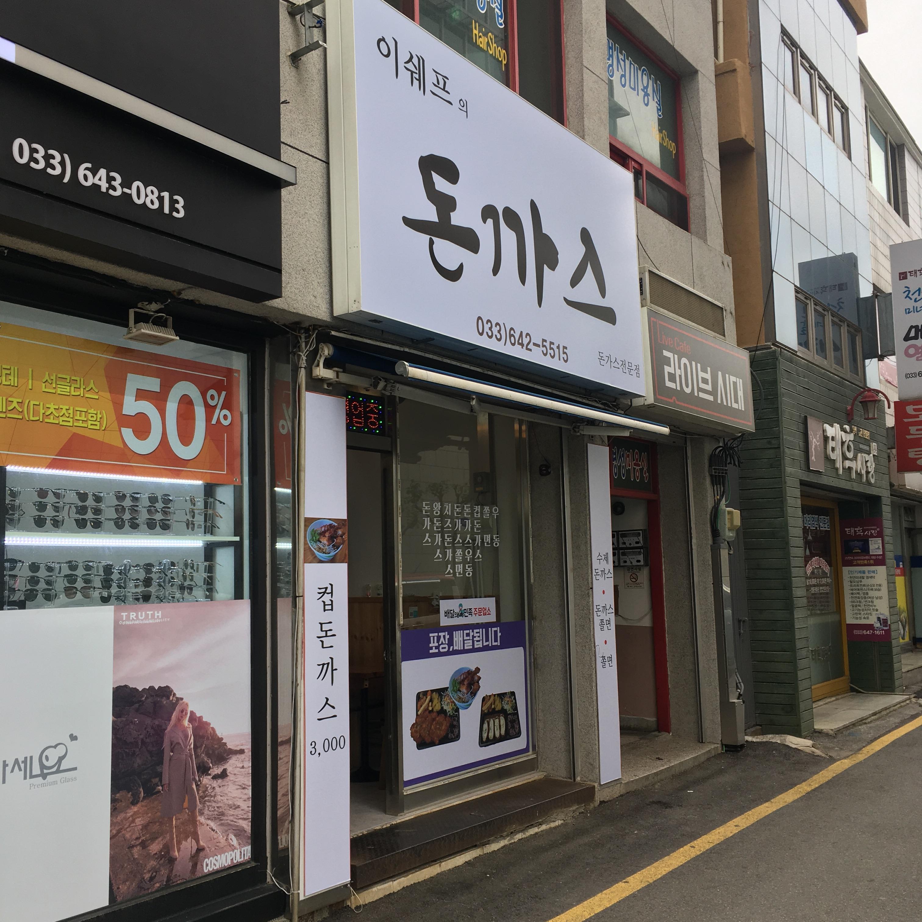 강릉 교보생명 건물 옆 골목에 있는 돈까스 집. 내부는 아담하여 많은 인원이 들어갈 수 없지만, 안에서도 식사가 가능하다. 내부 손님보다는 배달 어플 손님이 더 많은 곳. 사장님이 친절하시다.