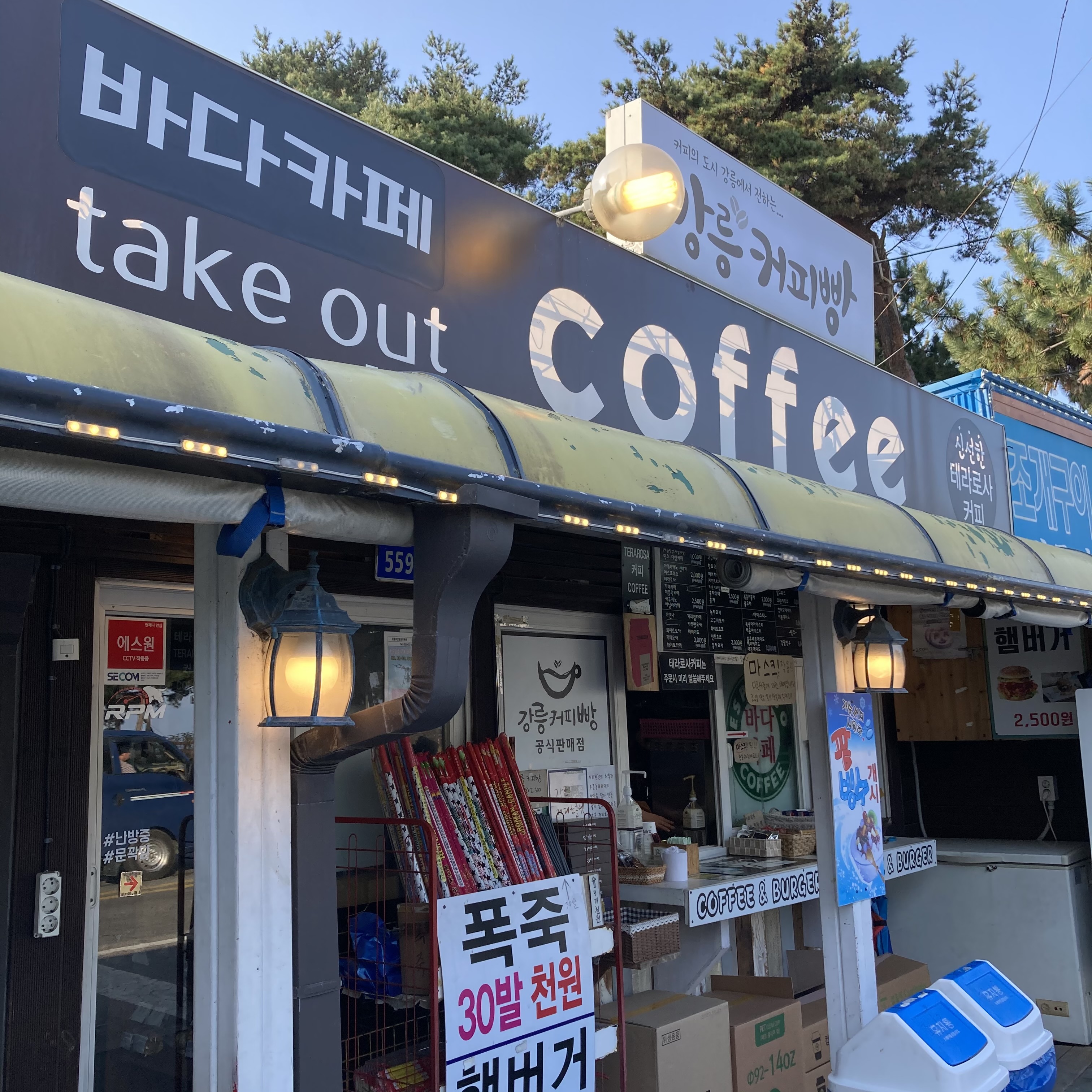 강릉 경포 해변 근처에 있는 커피가 1천원인 곳. 가격이 가격인지라 커피는 일반 카페와 비교하여 연한편이고, 컵 크기 역시 편의점 커피만하다. 그래도 가격 깡패인 곳. 카드도 결제가 가능하다.