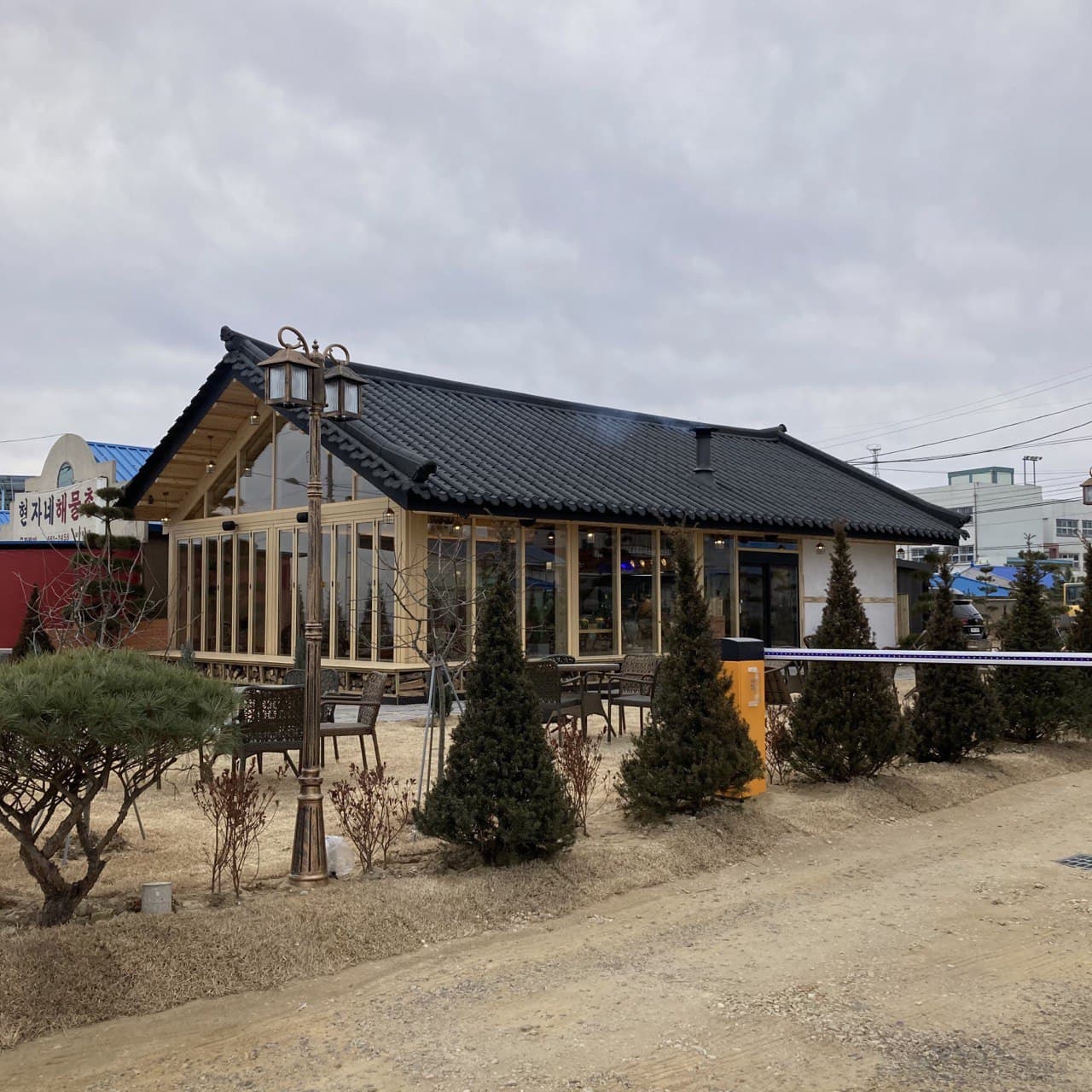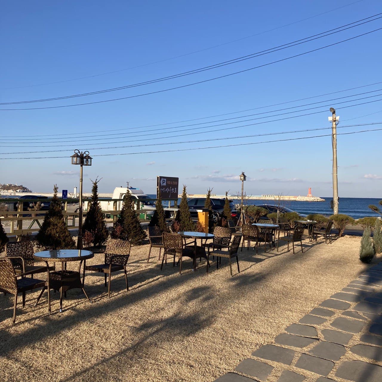 도깨비 촬영지(주문진 방사제) 근처에 있는 한옥 카페. 창 밖으로 바다가 보인다. 카페 내부에 화목난로가 있어 따뜻한 느낌이 난다.