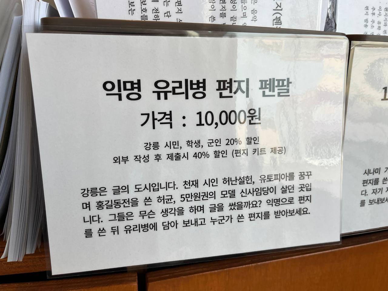 강릉은 글의 도시입니다. 천재 시인 허난설헌부터 유토피아를 꿈꾸며 홍길동전을 쓴 허균, 5만원권의 모델로 유명한 문인 신사임당이 살던 곳입니다. 그들은 무슨 생각을 하며 글을 썼을까요? 익명으로 편지를 쓰고 누군가 익명으로 쓴 편지를 받아보세요.