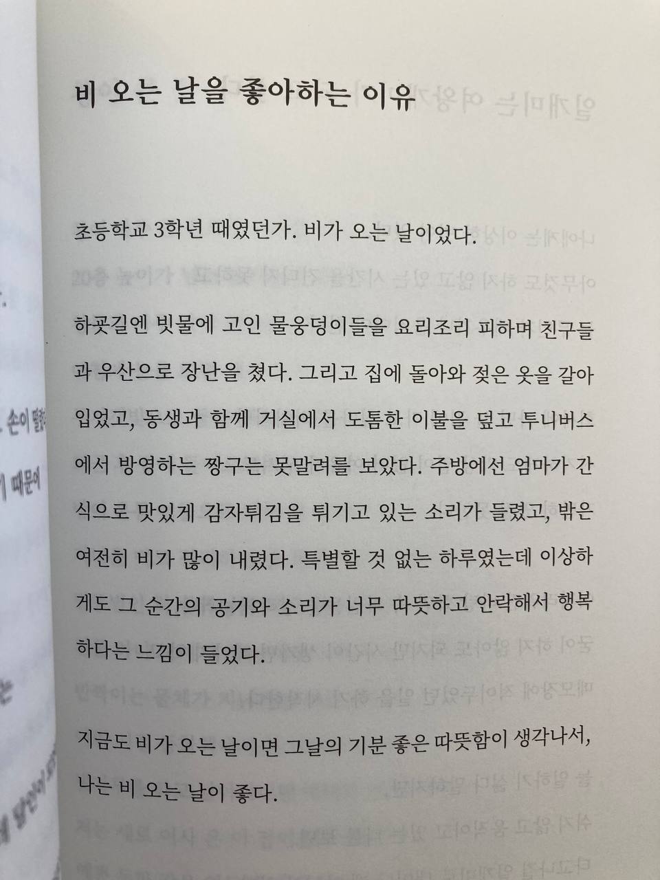 하굣길에 빗물에 고인 물웅덩이들을 요리조리 피하며 친구들과 우산으로 장난을 쳤다. 그리고 집에 돌아와 젖은 옷을 갈아 입었고, 동생과 함께 거실에서 도톰한 이불을 덮고 투니버스에서 방영하는 짱구는 못말려를 보았다. 주방에선 엄마가 간식으로 맛있게 감자튀김을 튀기고 있는 소리가 들렸고, 밖은 여전히 비가 많이 내렸다. 특별할 것 없는 하루였는데 이상하 게도 그 순간의 공기와 소리가 너무 따뜻하고 안락해서 행복 하다는 느낌이 들었다.
