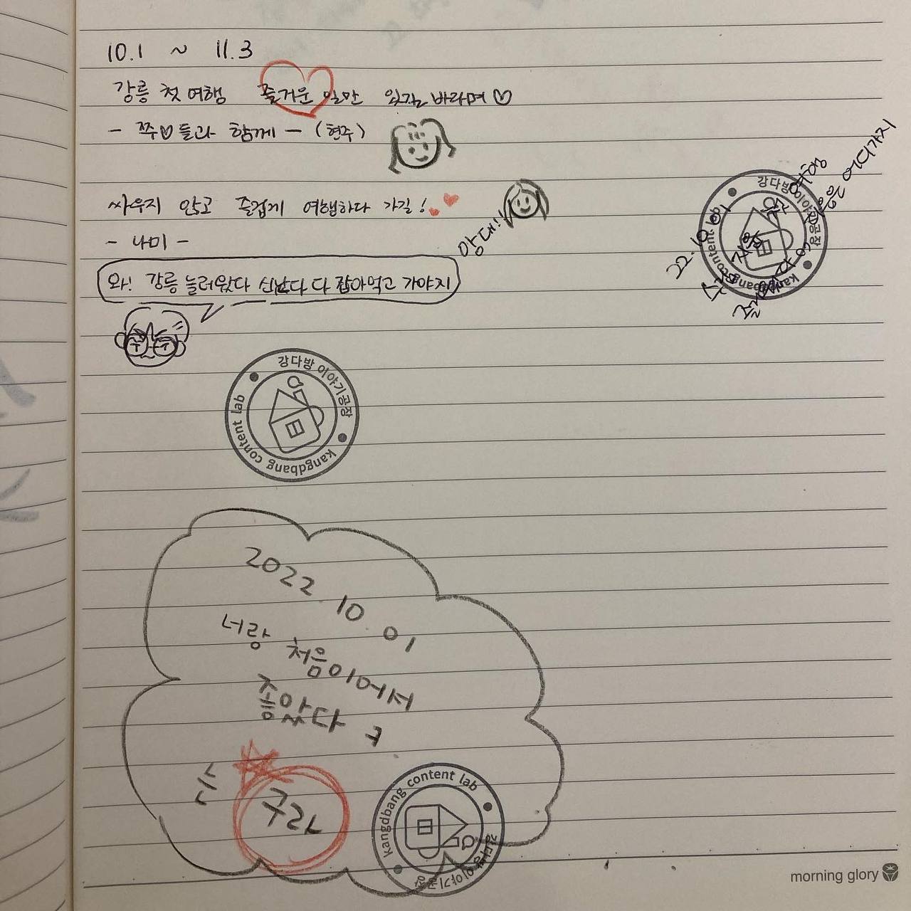 10. 1 ~ 11. 3 강릉 첫 여행 즐거운 일만 ❤️ 있길 바라며 ❤️ - 쭈❤️들과 함께 - (현주) 싸우지 않고 즐겁게 여행하다 가길! 💕 - 나미 - 와! 강릉 놀러왔다 신난다 다 잡아먹고 가야지 앙대!! 22. 10. 01. 수진, 지윤 첫 여행 즐거웠다 다음은 어디가지 2022. 10. 01 너랑 처음이어서 좋았다 ㅋ 는 구라 ⭐ 나나, 양군, 라온 강릉 여행❤️ 점심 존맛... 같이 와줘서 고맙다! 22 하늘 연달 사흘 22. 10. 08 수진이랑 바다구경 ~∪~ 22. 10. 09 두번째 강다방 방문 바다가 고파서 무작정 찾아온 강릉에서 따뜻함을 선물받고 갑니다. 항상 행복하세요 :) 22. 10. 15 ❤️❤️ 처음으로 한 가게에서 10만원 가까이 써본다! 하니 멋쩍게 웃으시던 사장님...