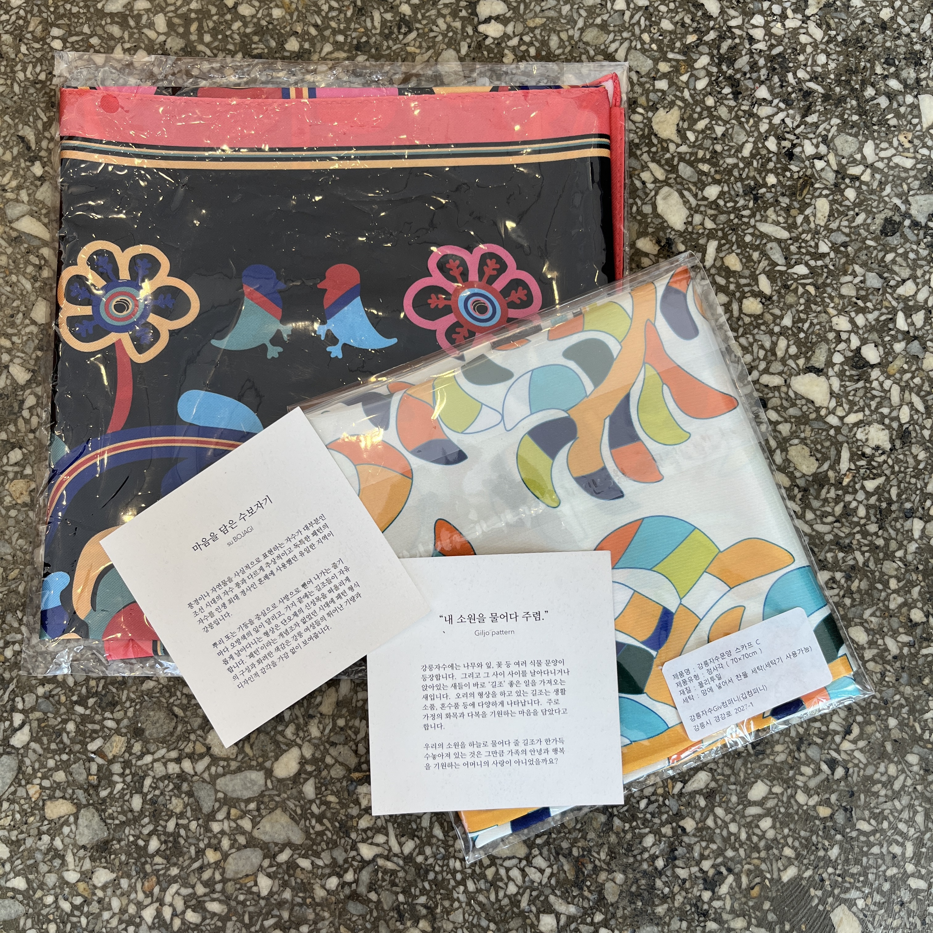 강릉 기념품 강릉 자수 문양 스카프, 깁스토리랩 가격 : 45,000원 크기 : 가로x세로 70x70cm 재질 : 폴리투일 강릉 자수 문양을 사용하여 만든 스카프. 강릉 자수는 19세기 강릉 여인들에 의해 수놓아졌던 강릉의 문양이다. 조선 시대 자수는 보통 풍경이나 자연물을 사실적으로 표현하는 자수가 대부분인데, 강릉 자수는 추상적이고 독특한 패턴이 특징이다. 강릉 자수 문양에는 행운과 번영, 장수, 안녕을 바라는 뜻이 담겨있다. 깁스토리랩 https://givstory.com/ 강릉자수 Giv Story Lab 당신의 미술관 강릉자수의 엄선된 50만원 이상의 고가 상품 또는 비매 작품 (비매 작품의 경우 유료 대여 가능)들을 만나보실 수 있습니다. 자세히보기 givstory.com 마음을 담은 수보자기..