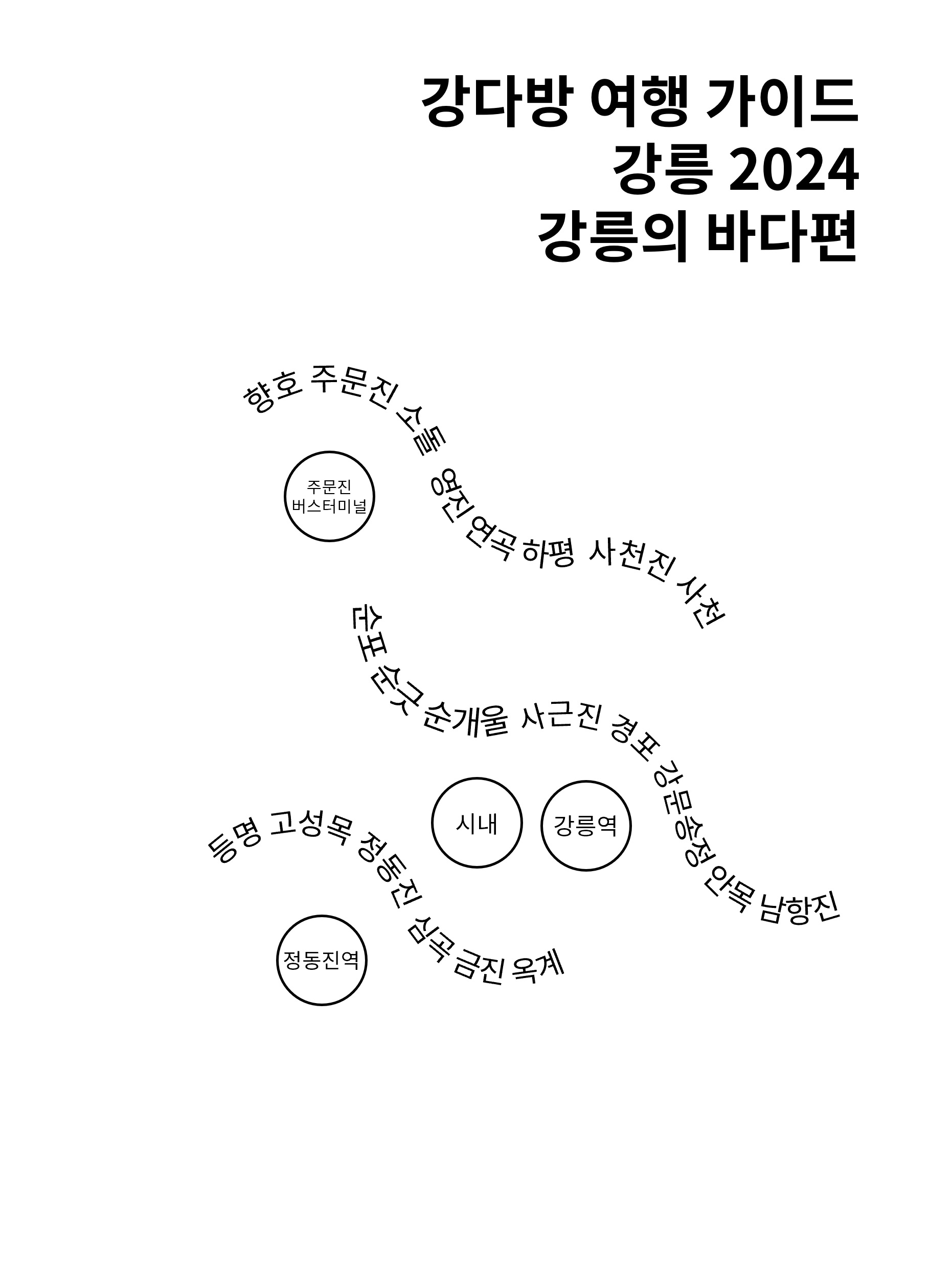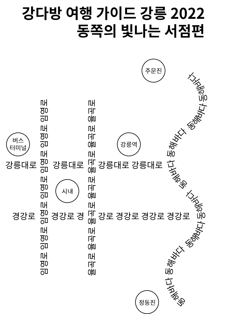 강다방강릉 바다 18 Gangneung Beaches 18 누구나 언제나 찾아 갈 수 있는자신만의 바다가 있길 바라며Hoping that everyone has their own beachthey can visit anytime 강릉의 바다Gangneung's Beaches강릉 이주 6년차. 주변에서 하도 가장 가까운 바다가 어디예요? 어느 바다가 좋아요? 물어봐 제작하게 된 강릉 바다 가이드북. 여기도 좋고 저기도 좋고 다 좋은데 어떻게 설명할 방법이 없어서 만들어보았다. 관광객들에게 널리 알려진 안목과 경포 외에도 강릉에는 멋진 바다들이 많다. 그러니 때로는 한 번도 가보지 않은 각기 다른 매력의 바다도 용감히 도전해봤으면 좋겠다. 안목부터 주문진까지 해안도로, 정동진부터 심곡까지 해안단..