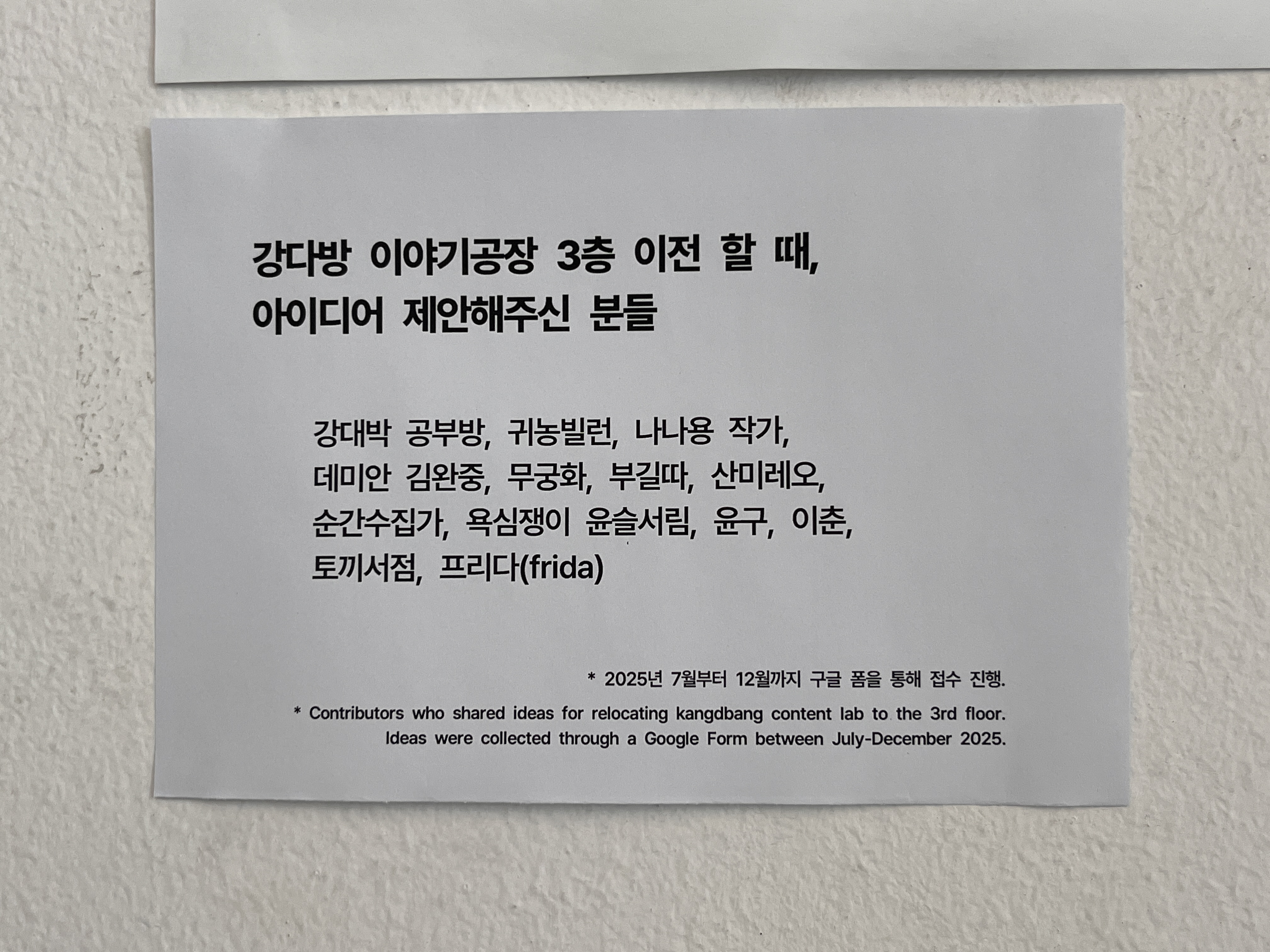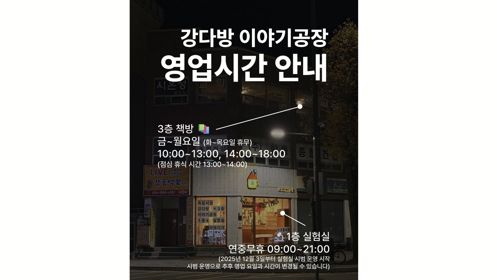 강다방 이야기공장강원특별자치도 강릉시 용지로 162 (옥천동 305-1) 1층, 3층독립서점 📚 이야기가 모여 숲이 되는 곳 🌲 강릉역 도보 5분 거리 위치 🚄 강다방 이야기공장과 관련된 더 많은 정보는아래 블로그, 인스타그램 등 사회 관계망 서비스(SNS)를 통해 확인할 수 있습니다.블로그 https://kangdbang.tistory.com스마트스토어 https://smartstore.naver.com/kangdbang인스타그램 https://www.instagram.com/kangdbang페이스북 https://facebook.com/kangdbang트위터 https://mobile.twitter.com/kangdbang핀터레스트 https://www.pinterest.co.kr/kang..